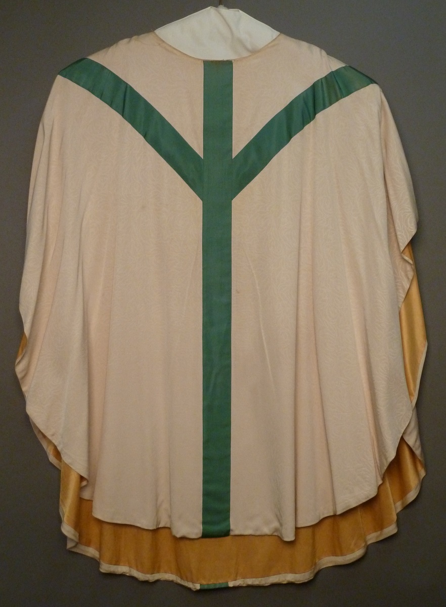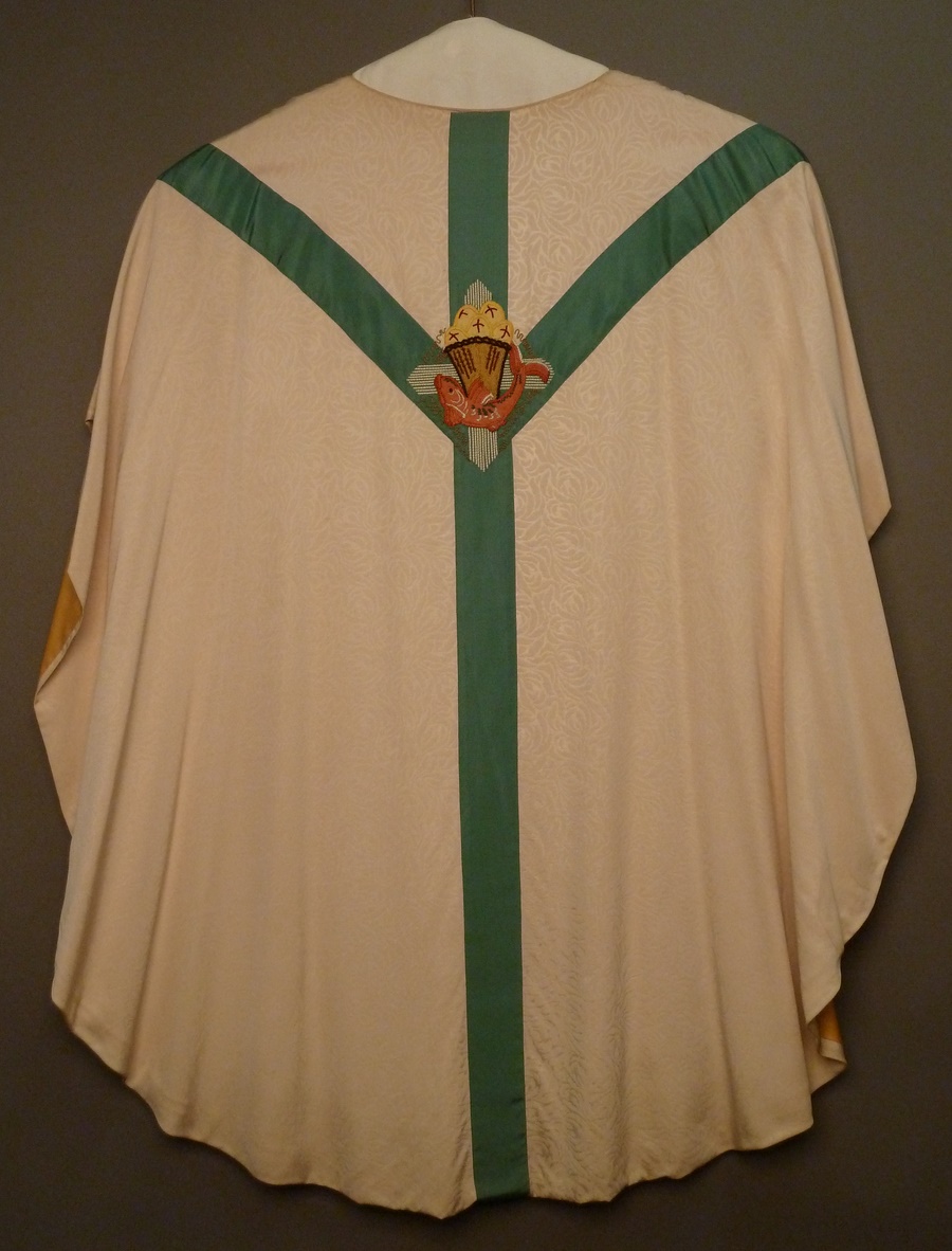 Wit kazuifel met groen gaffelkruis waarop vis met broodmand
