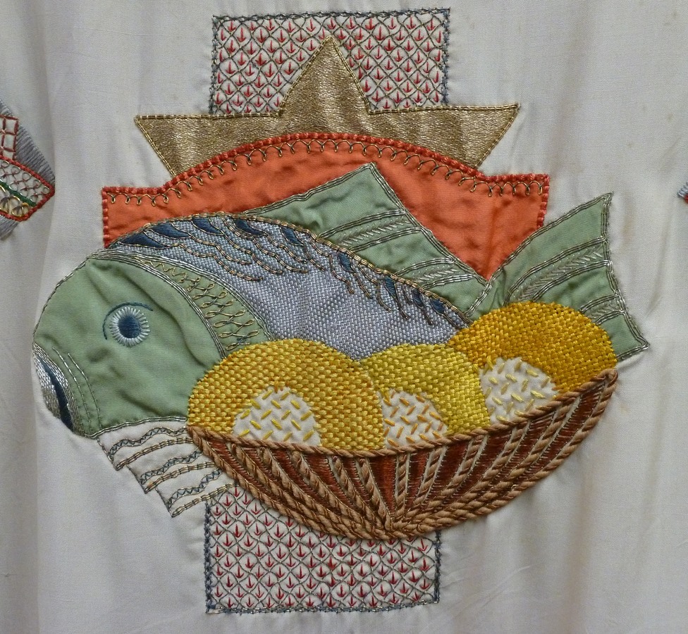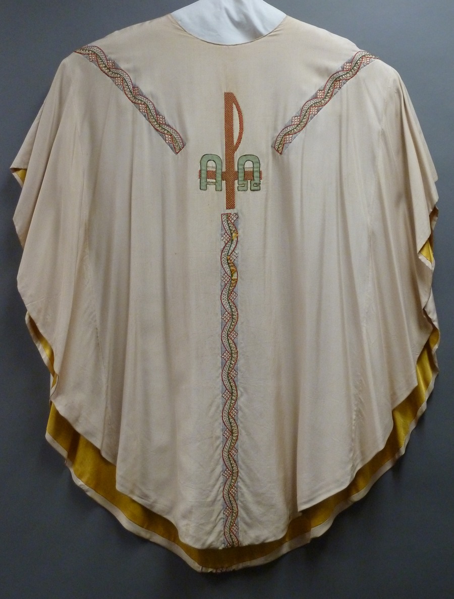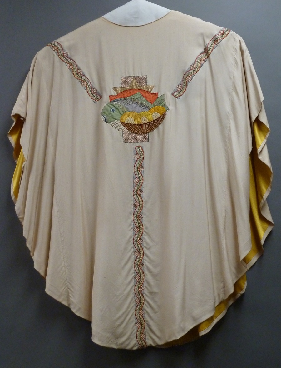 Wit kazuifel met geborduurd veelkleurig gaffelkruis waarin Christusmonogram en alfa en omega, op achterzijde vis met broodmand