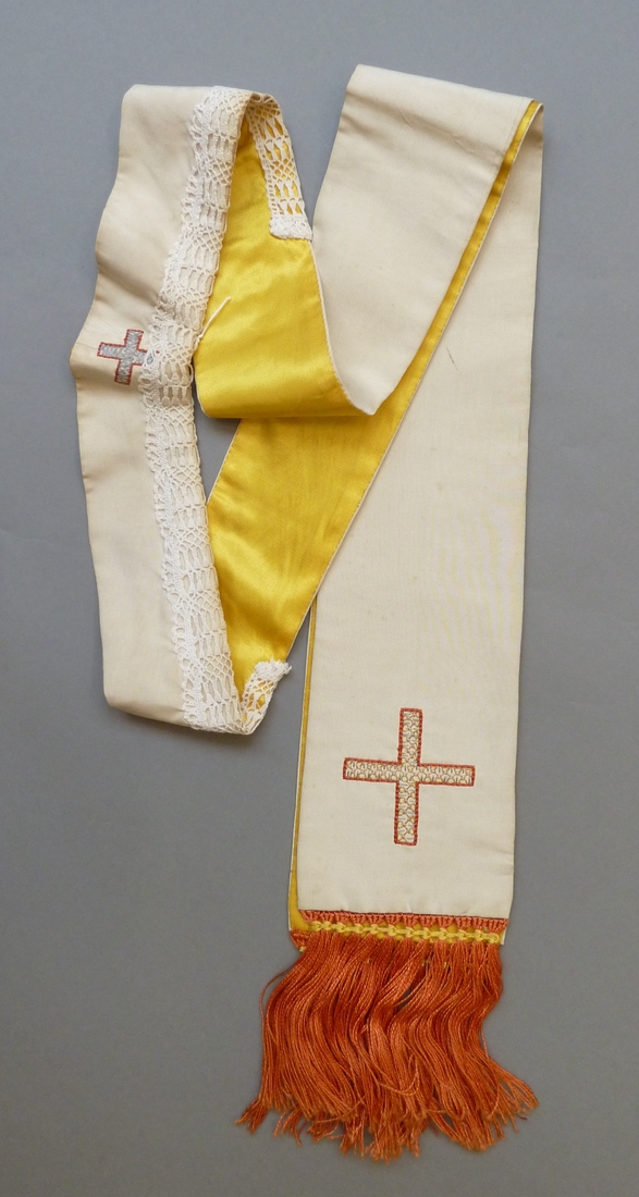 Witte stola met drie geborduurde kruisjes en franje, met kanten kraagje