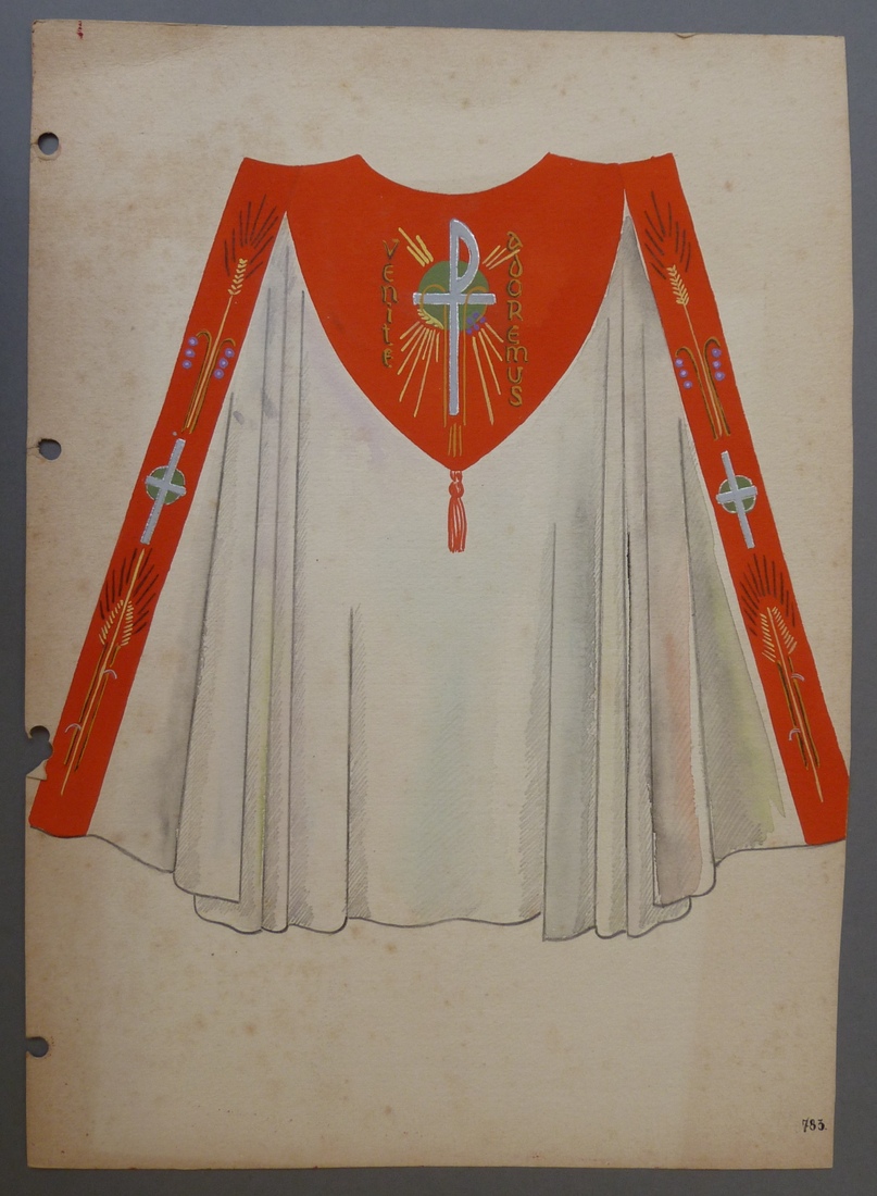 Ontwerp voor witte koorkap met zalmkleurig koorkapschild met Christusmonogram en "Venite adoremus"