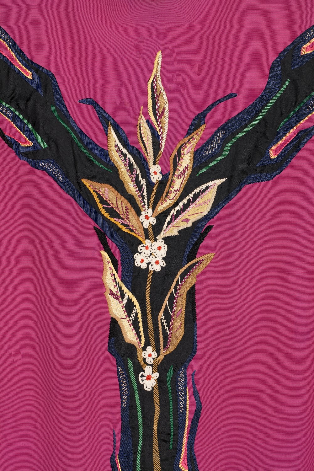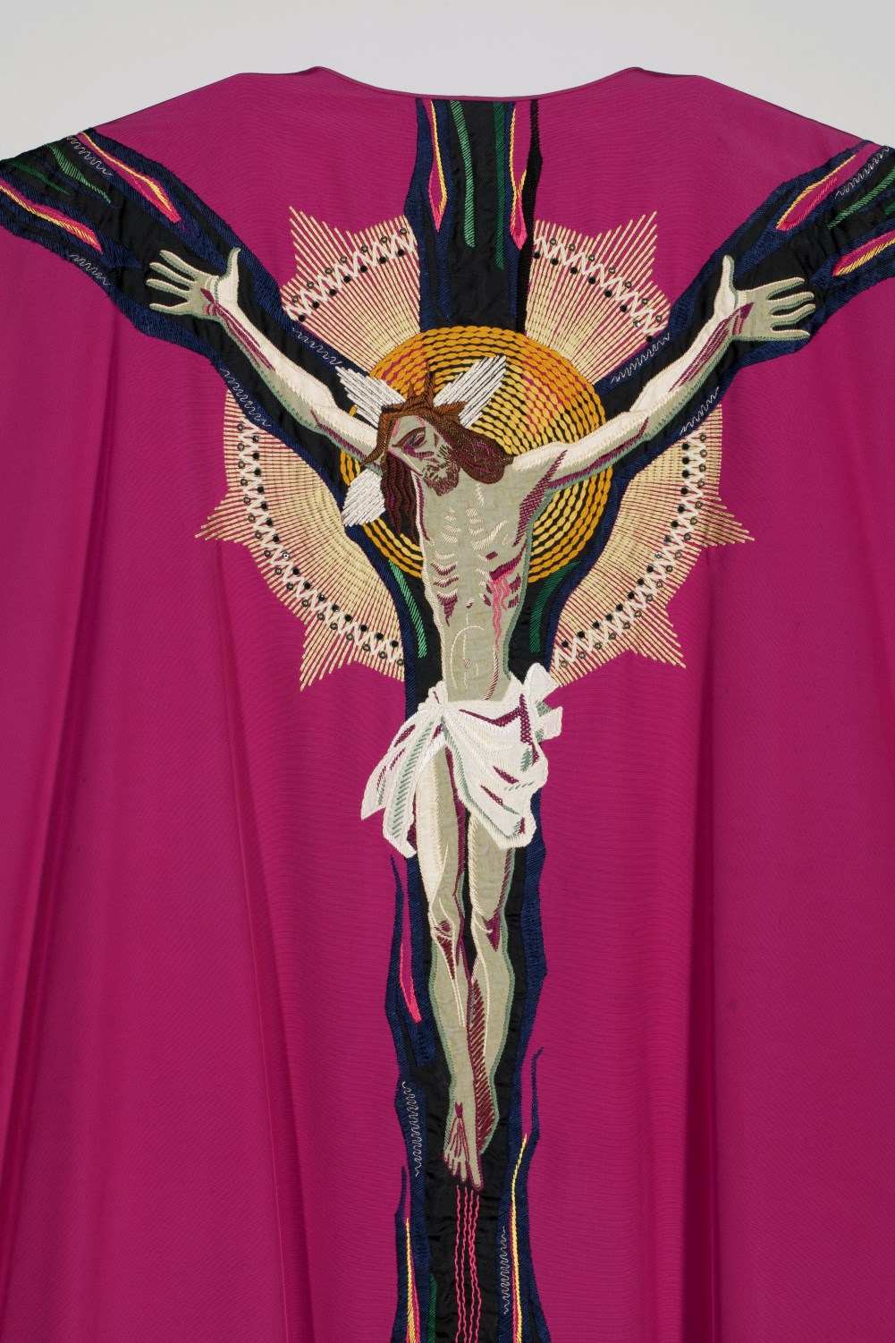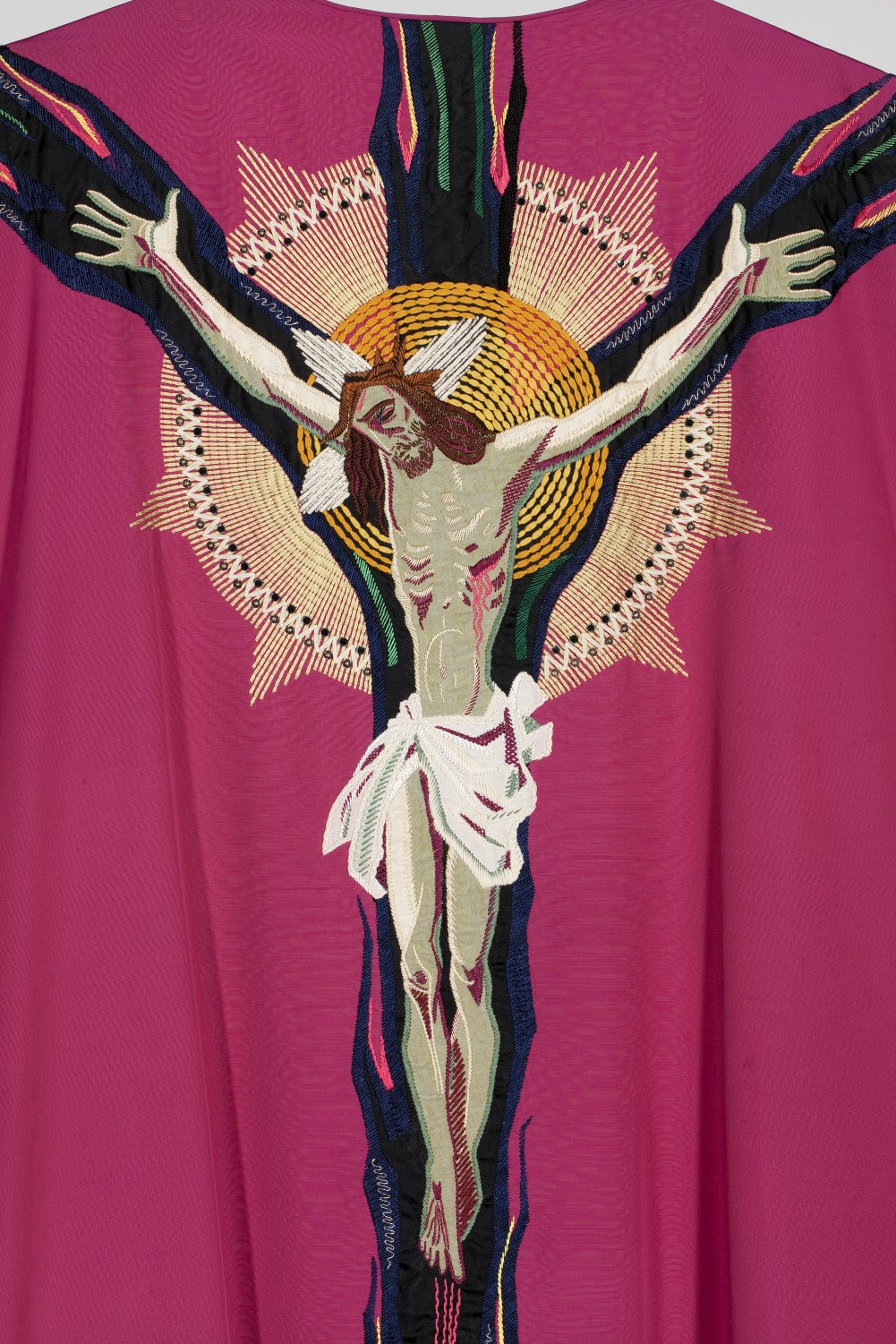 Paars kazuifel met zwart gaffelkruis geborduurd met florale motieven, op achterzijde geborduurde gekruisigde Christus