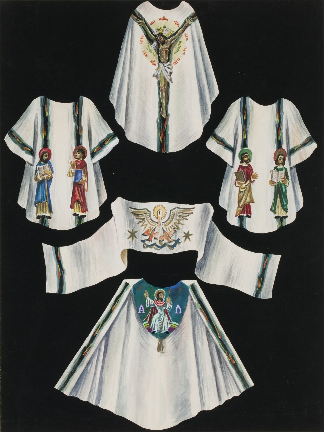 Ontwerp voor wit kazuifel met gekruisigde Christus, twee dalmatieken met evangelisten, schoudervelum met pelikaan en koorkap met Christus Koning