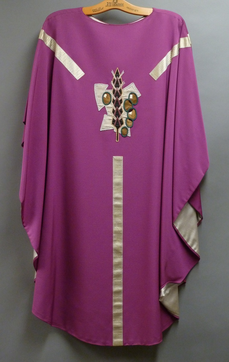 Paars kazuifel met zilveren gaffelkruis, met geborduurde korenaar