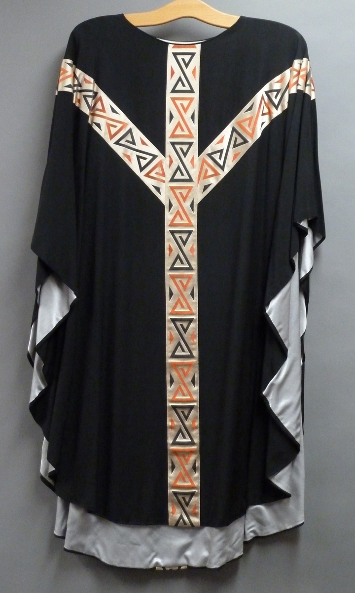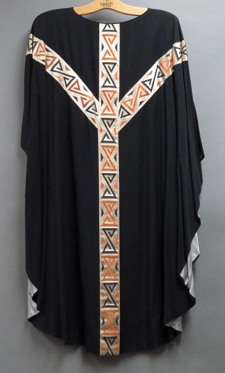 Zwart kazuifel met gaffelkruis waaop geometrische patronen in zwart en terra