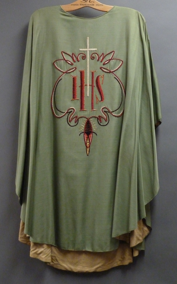 Groen kazuifel met IHS met kruis, op achterzijde geborduurd Lam Gods