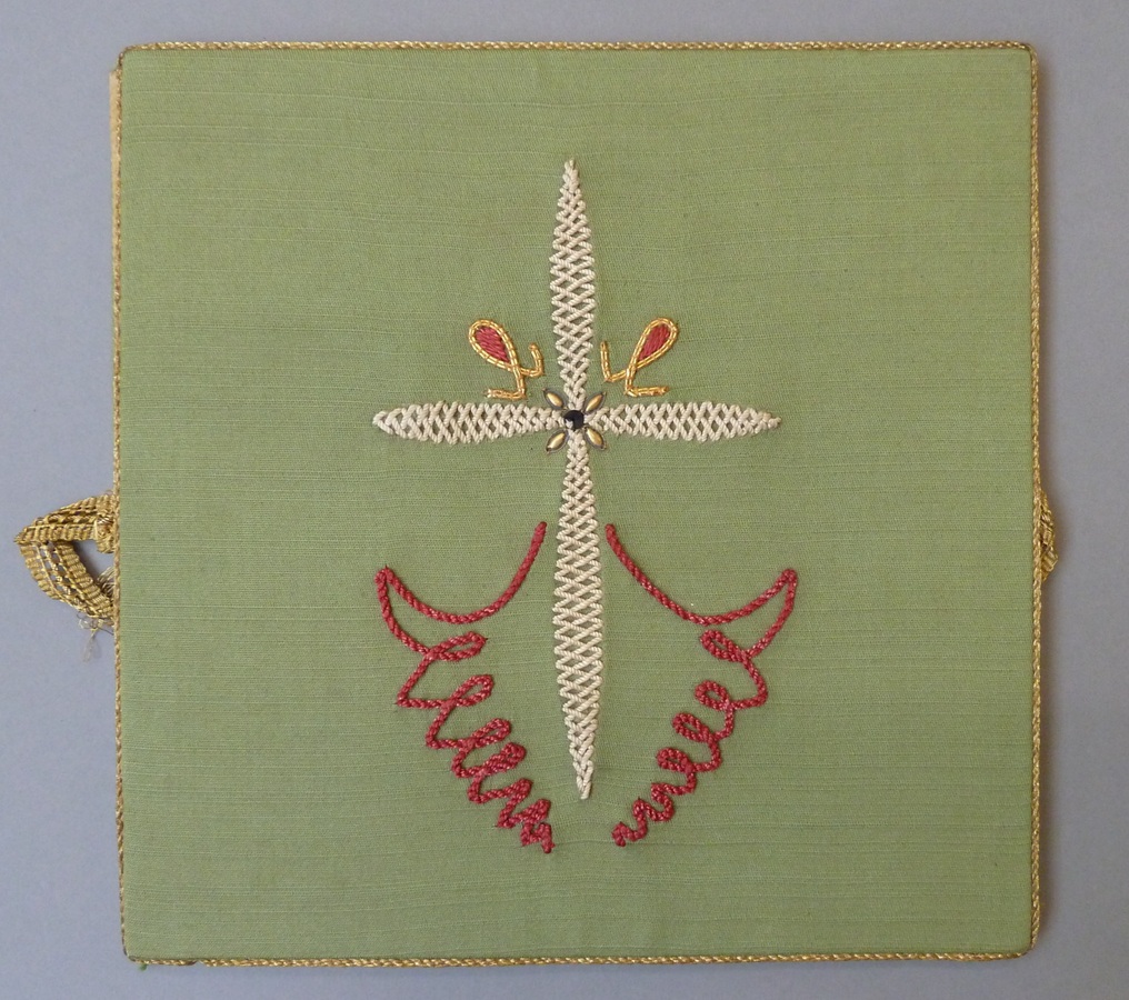 Groene beurs met geborduurd wit kruisje