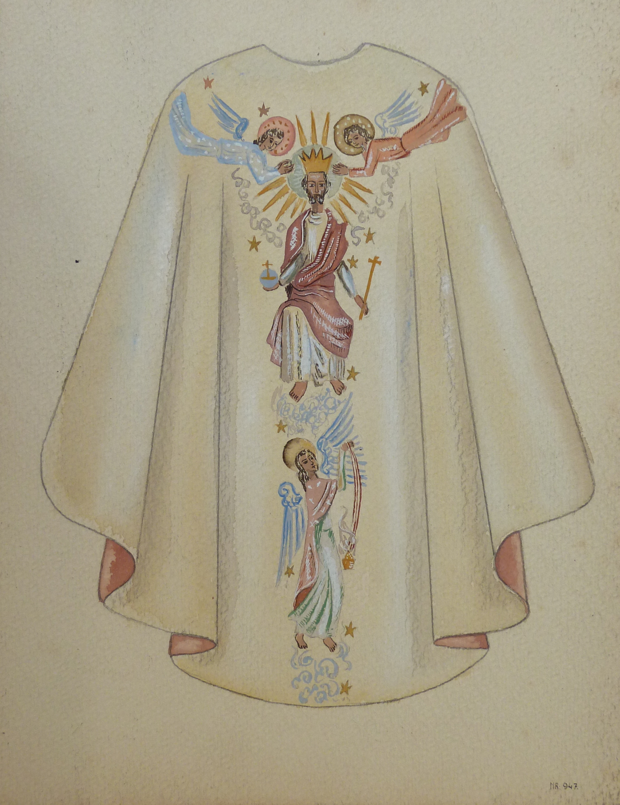 Ontwerp voor wit kazuifel met Christus Koning en drie engelen