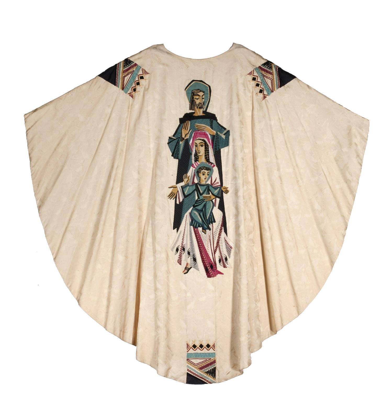 Wit kazuifel geborduurd met stermotief, op achterzijde Heilige Familie