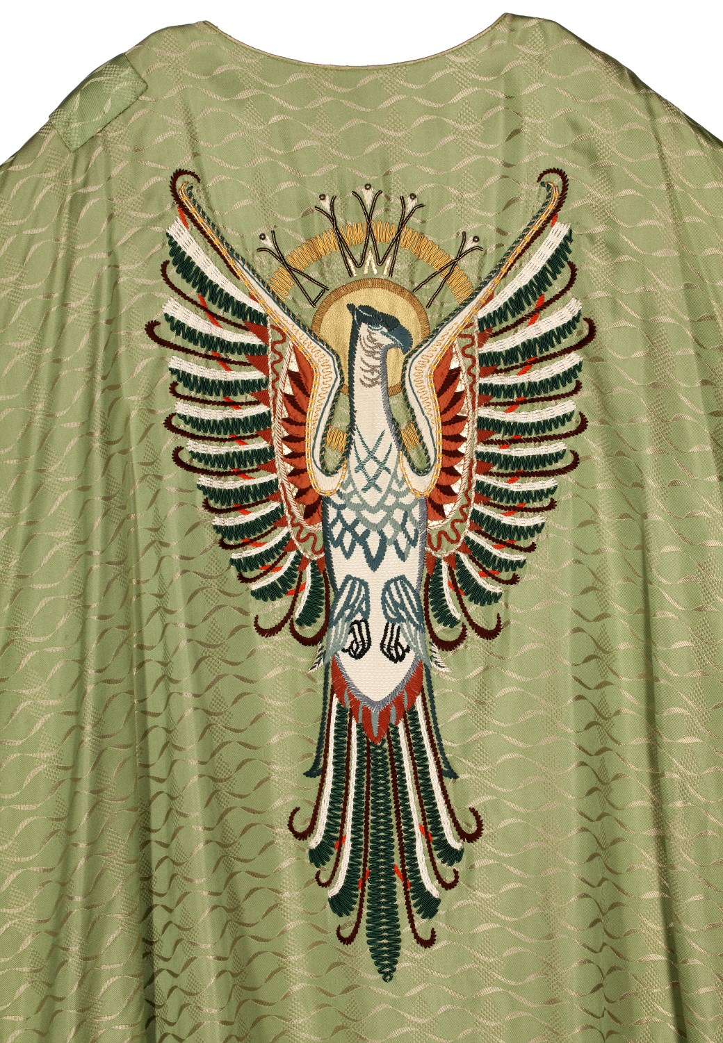 Groen kazuifel geborduurd met florale motieven, op achterzijde adelaar