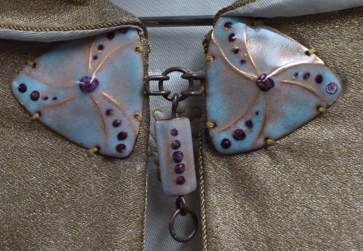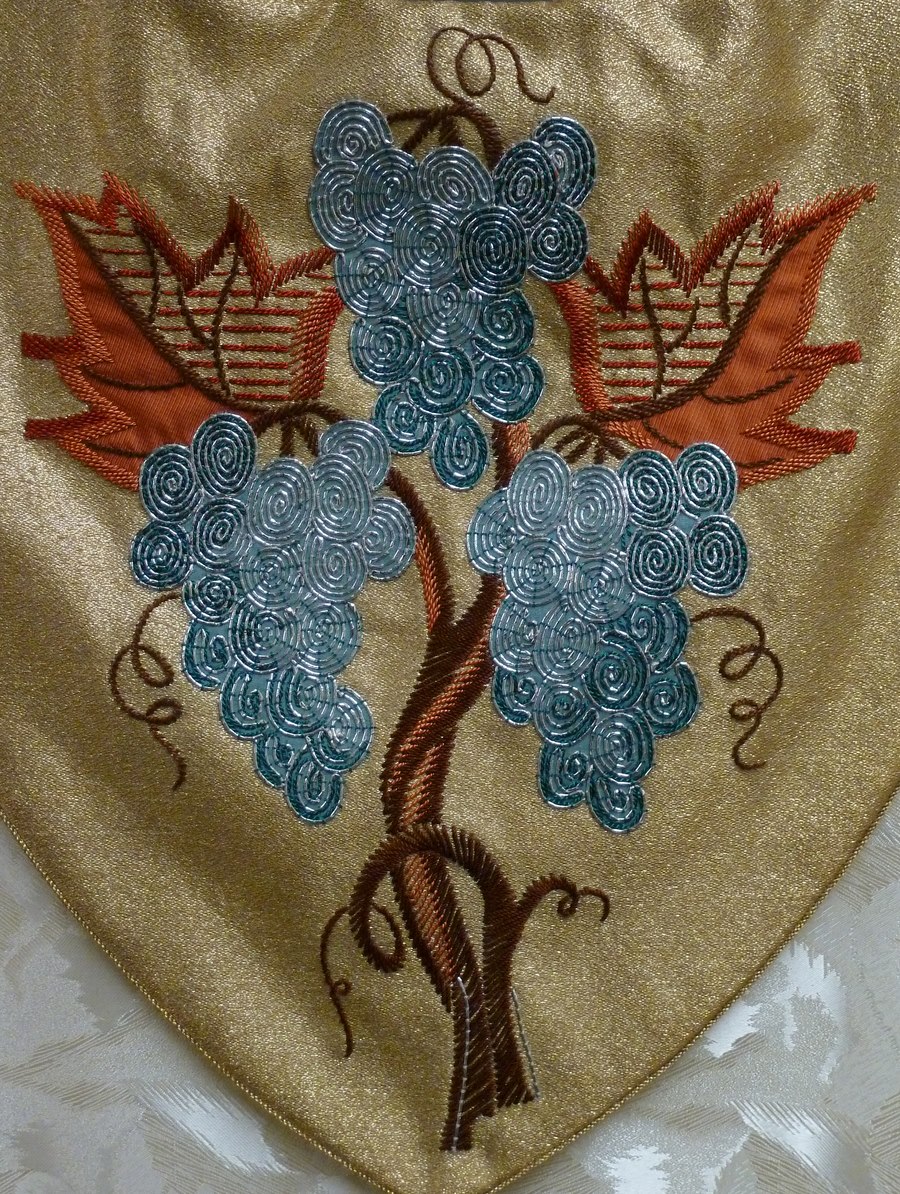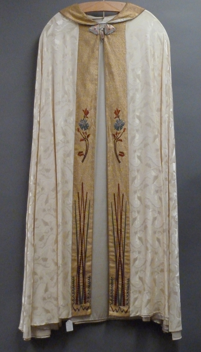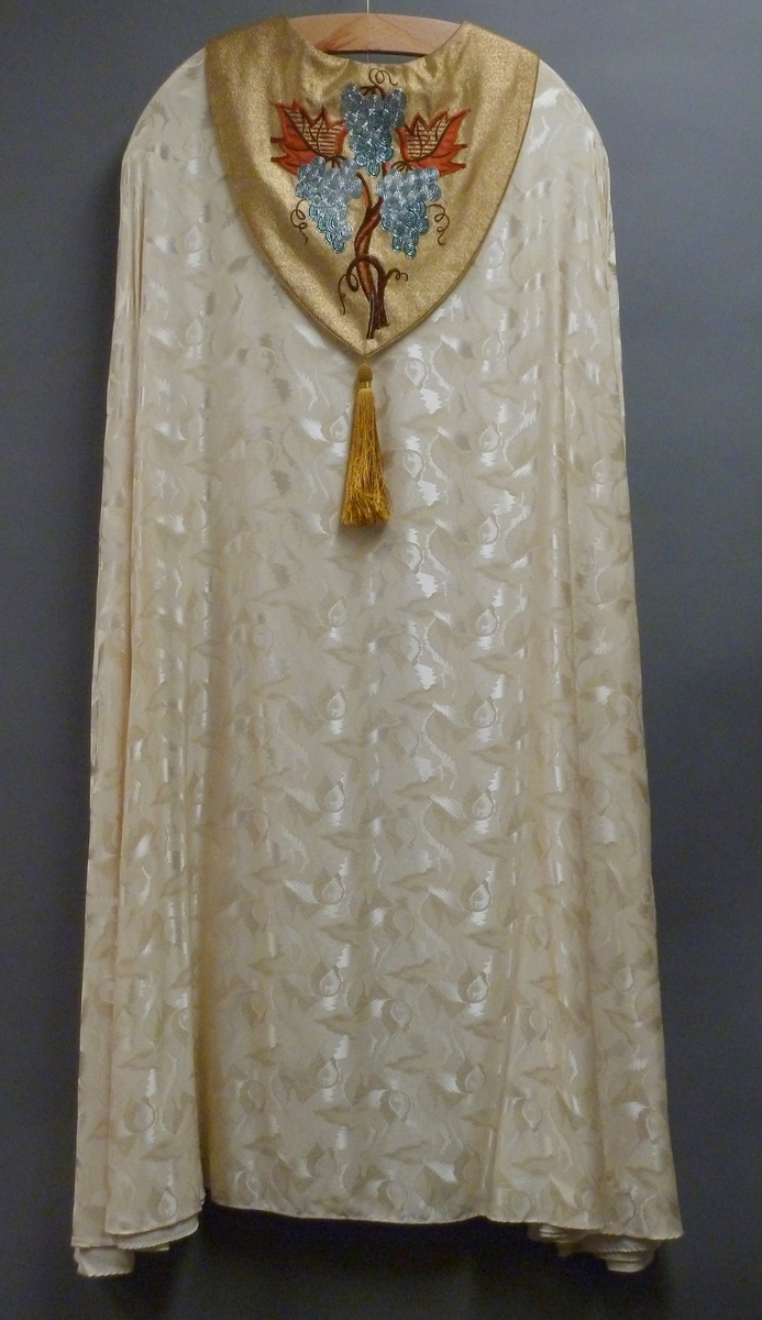 Witte koorkap met geborduurde wijnranken op koorkapschild, florale en geometrische motieven op aurifriezen, met geëmailleerde sluiting
