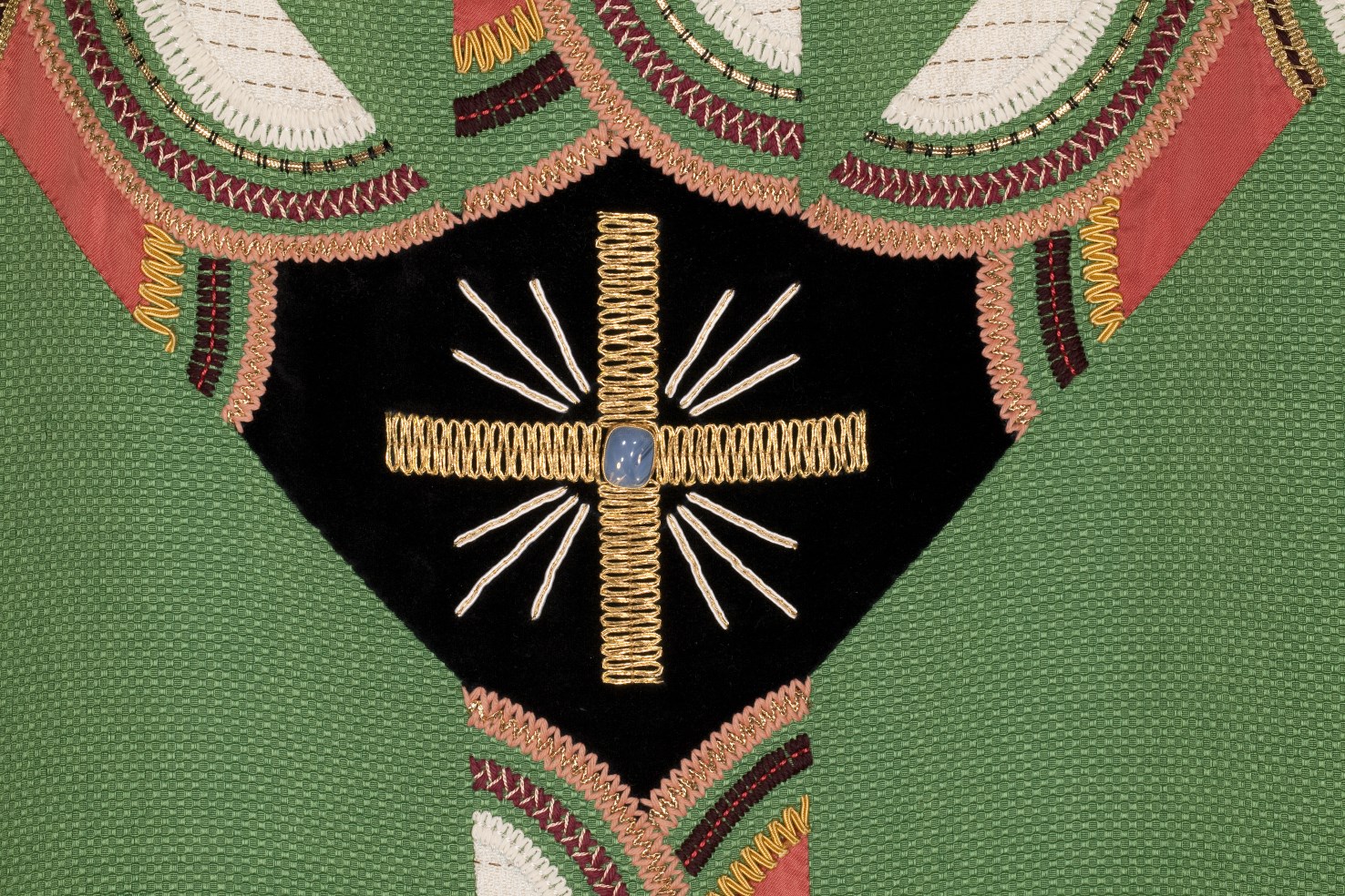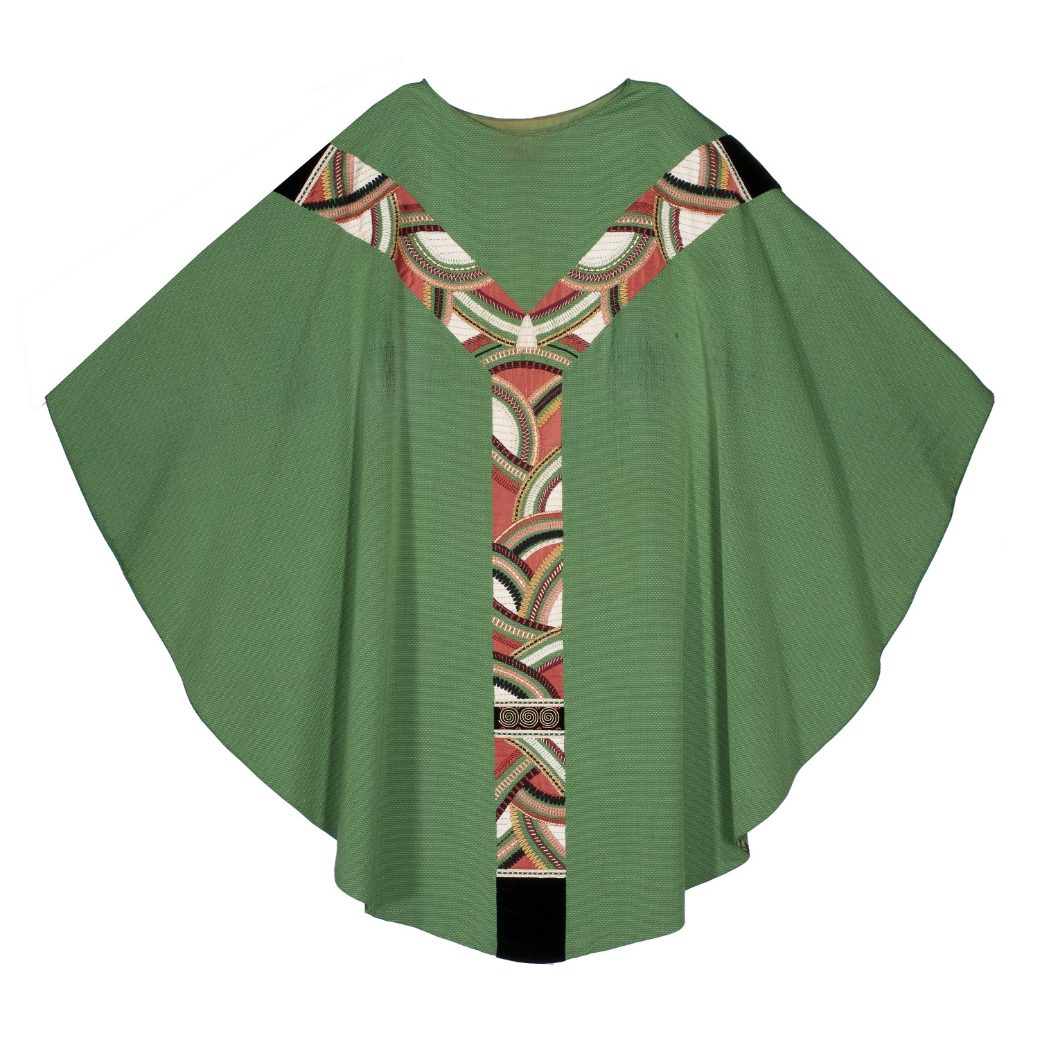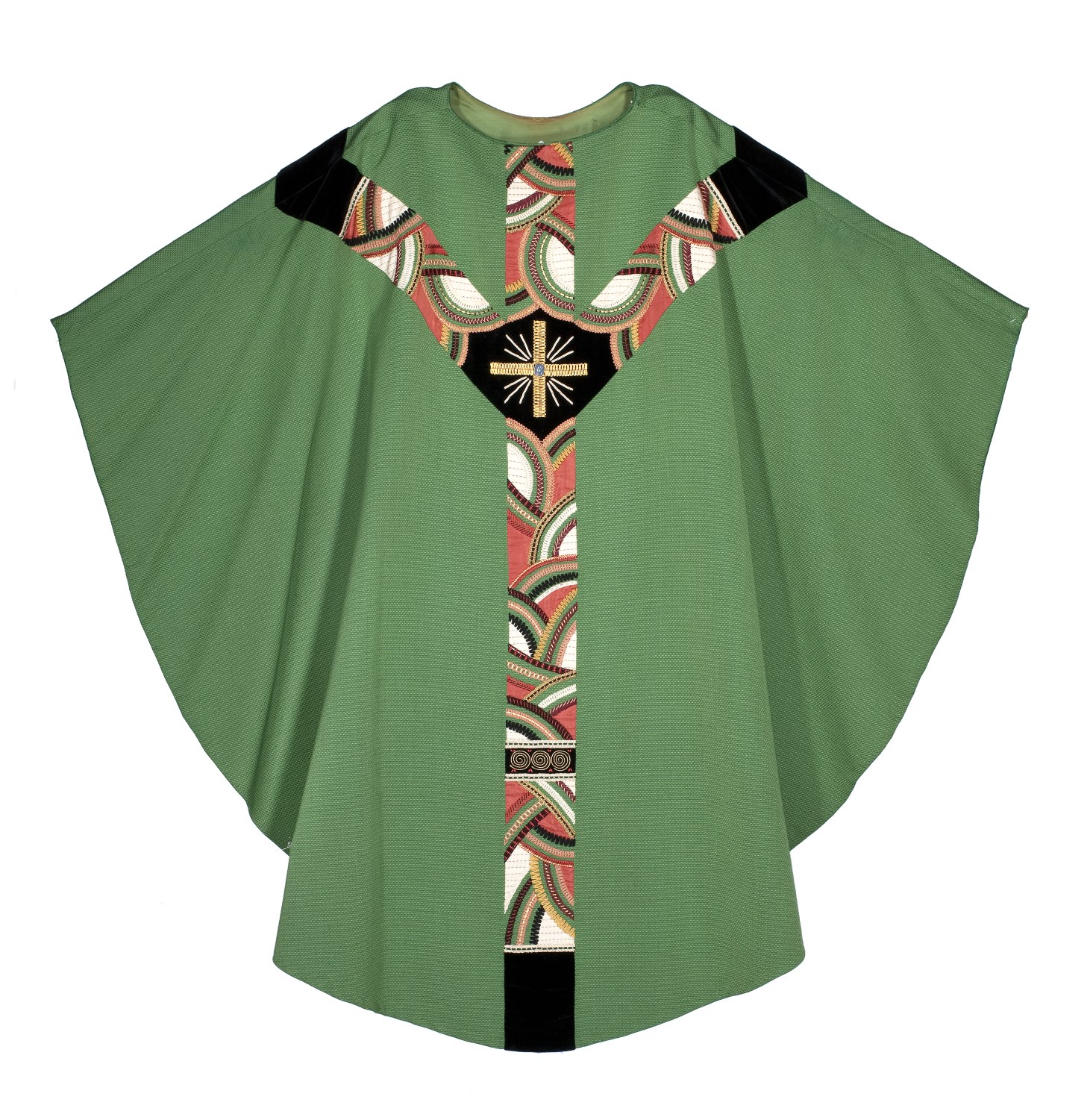 Groen kazuifel geborduurd met veelkleurig gaffelkruis, op achterzijde kruis van gouddraad