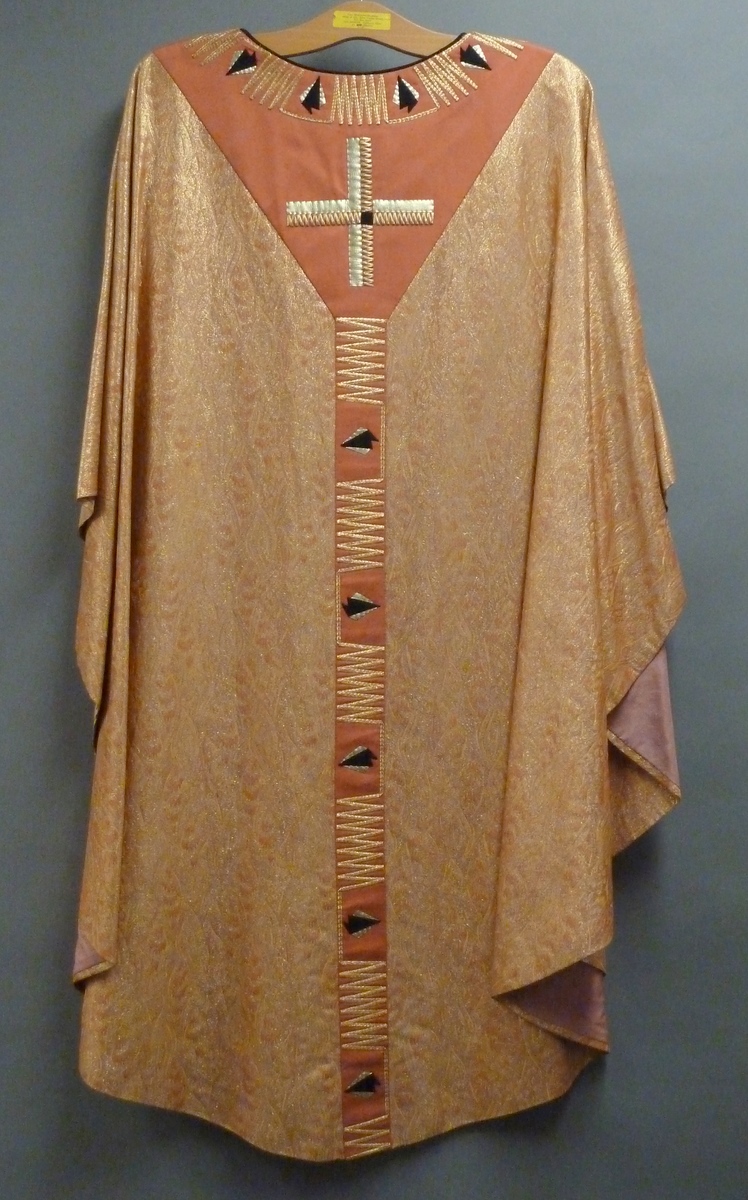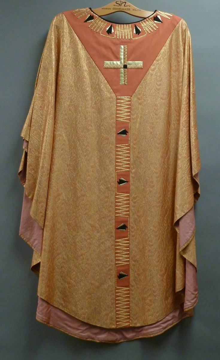 Goudkleurig kazuifel geborduurd met roze geappliceerd gaffelkruis waarop kruis aan voor- en achterzijde