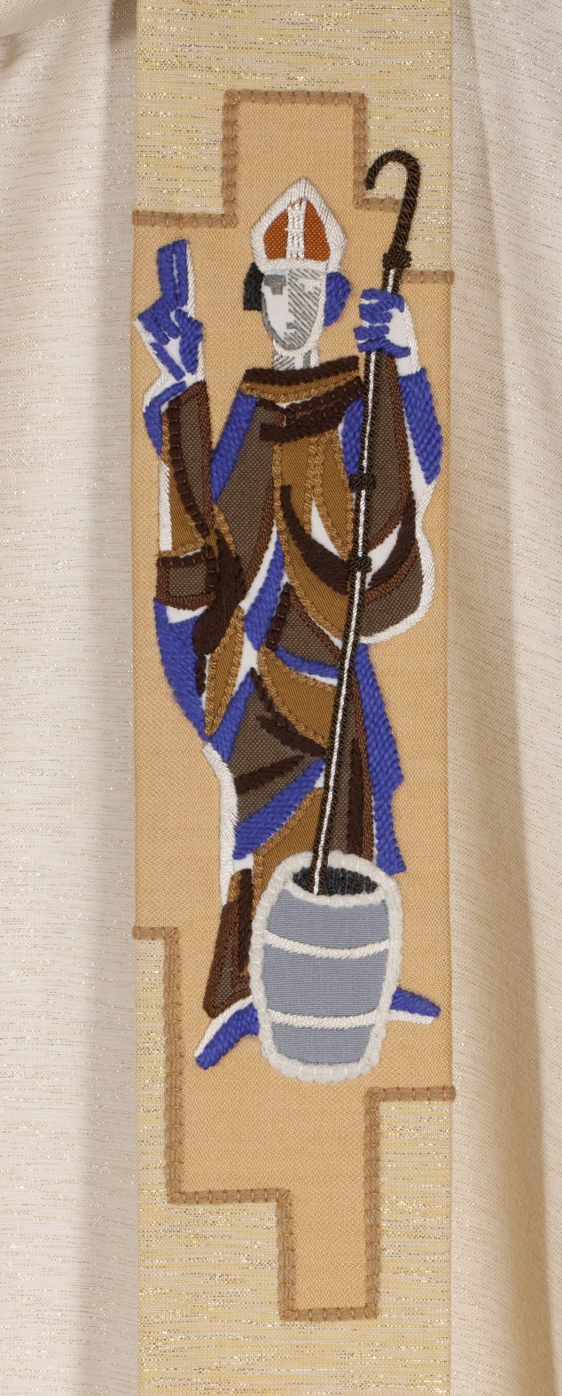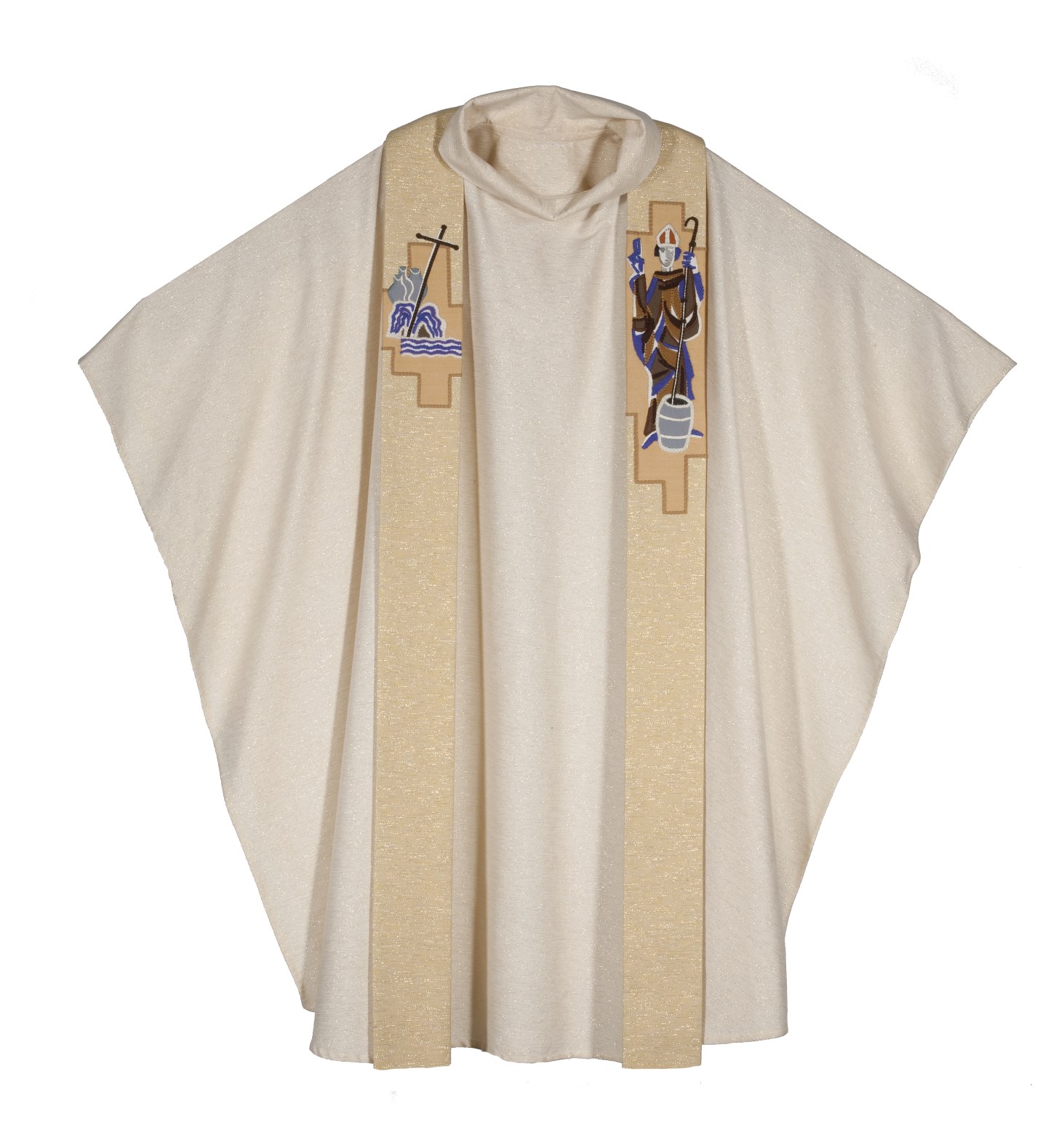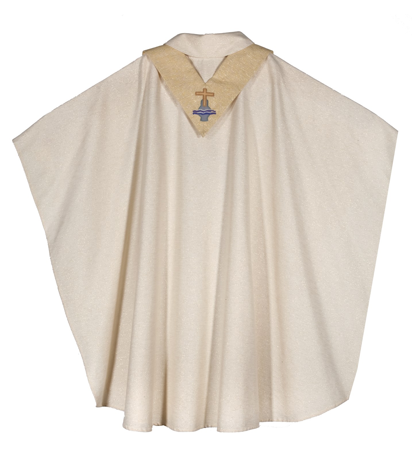 Wit kazuifel met gouddraad doorweven en omgeslagen kraag