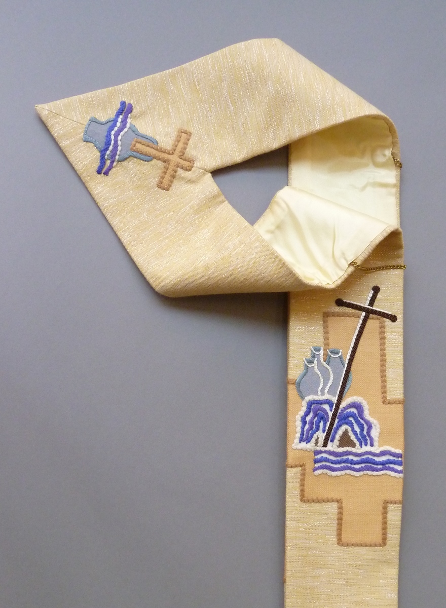 Witte stola met gouddraad doorweven met kruis, Willibrord met staf in wijnvat en met Willibrordusput