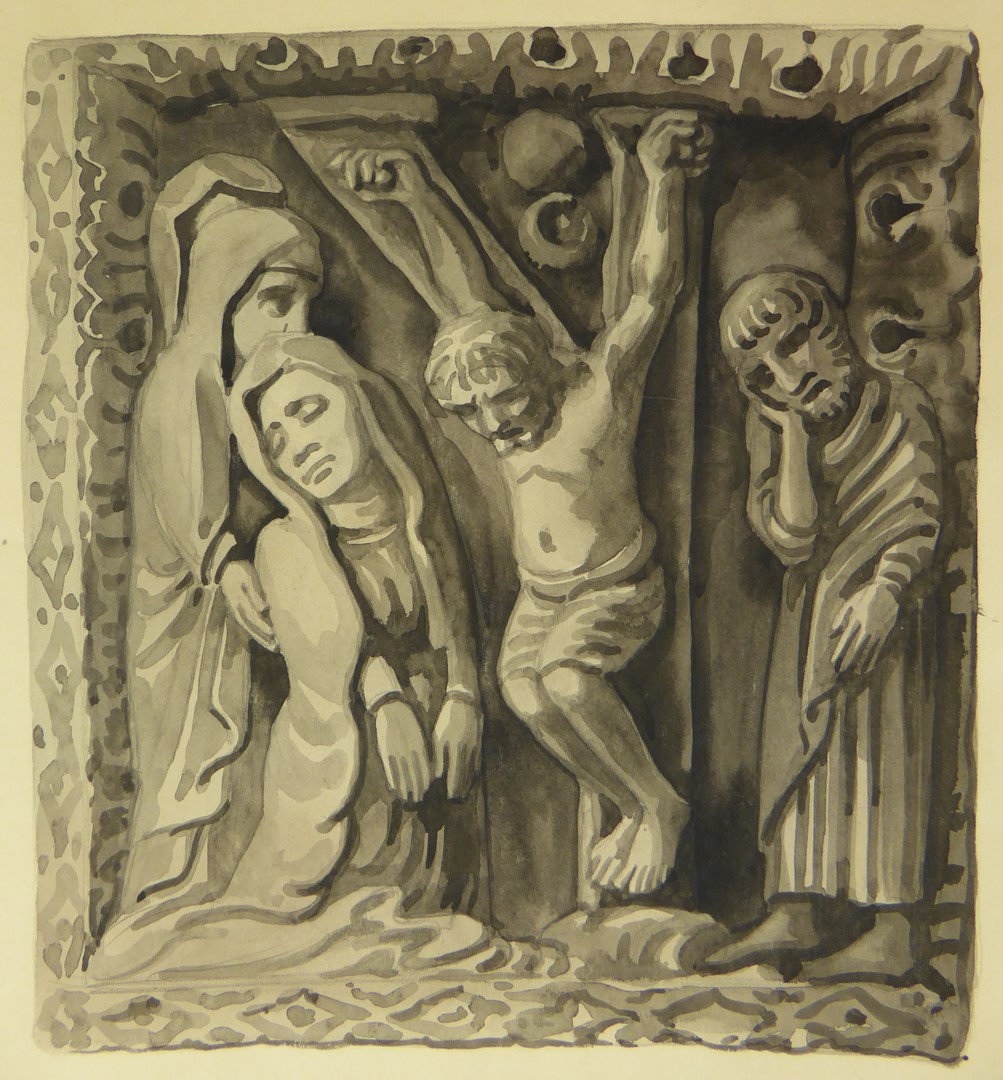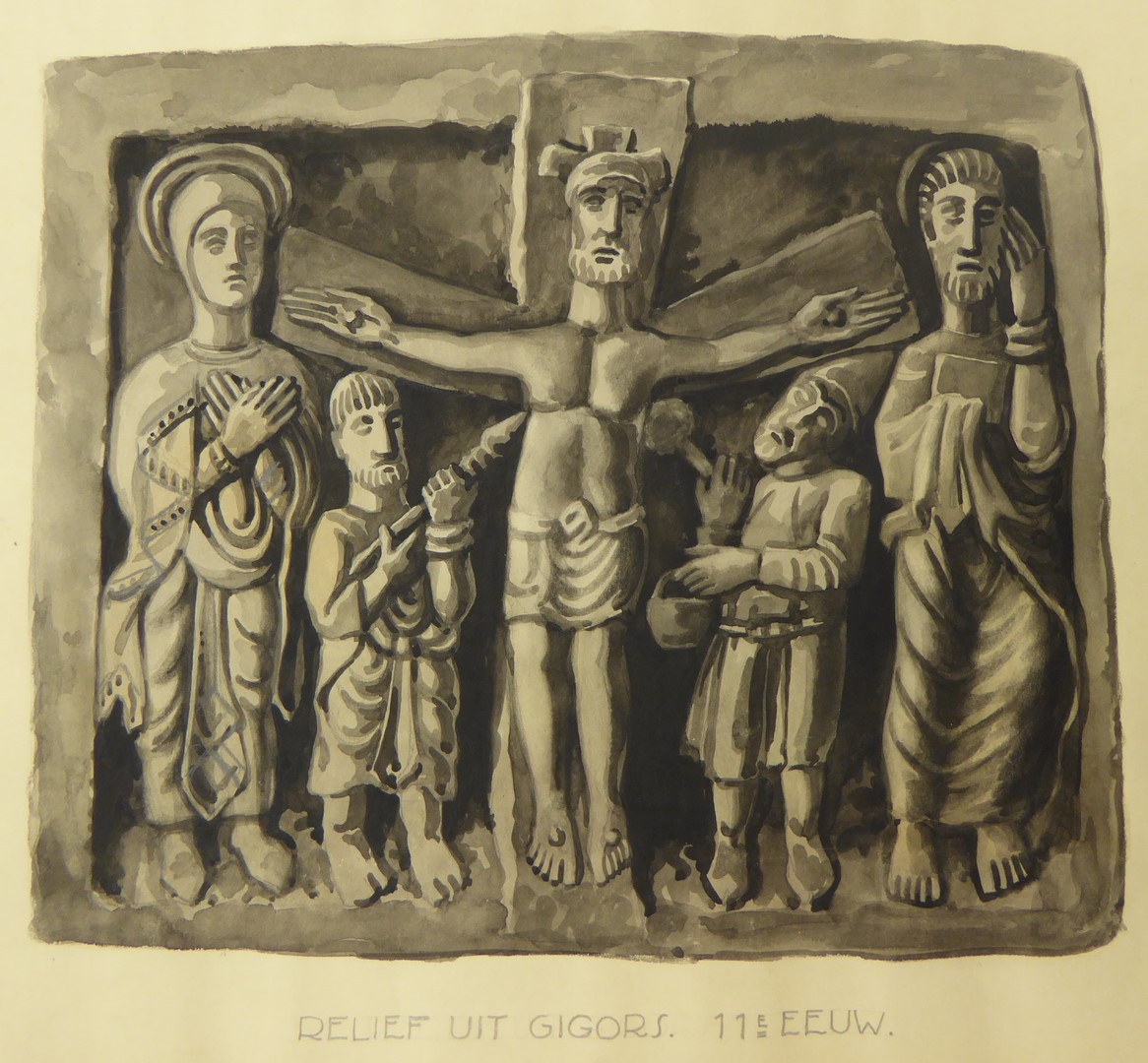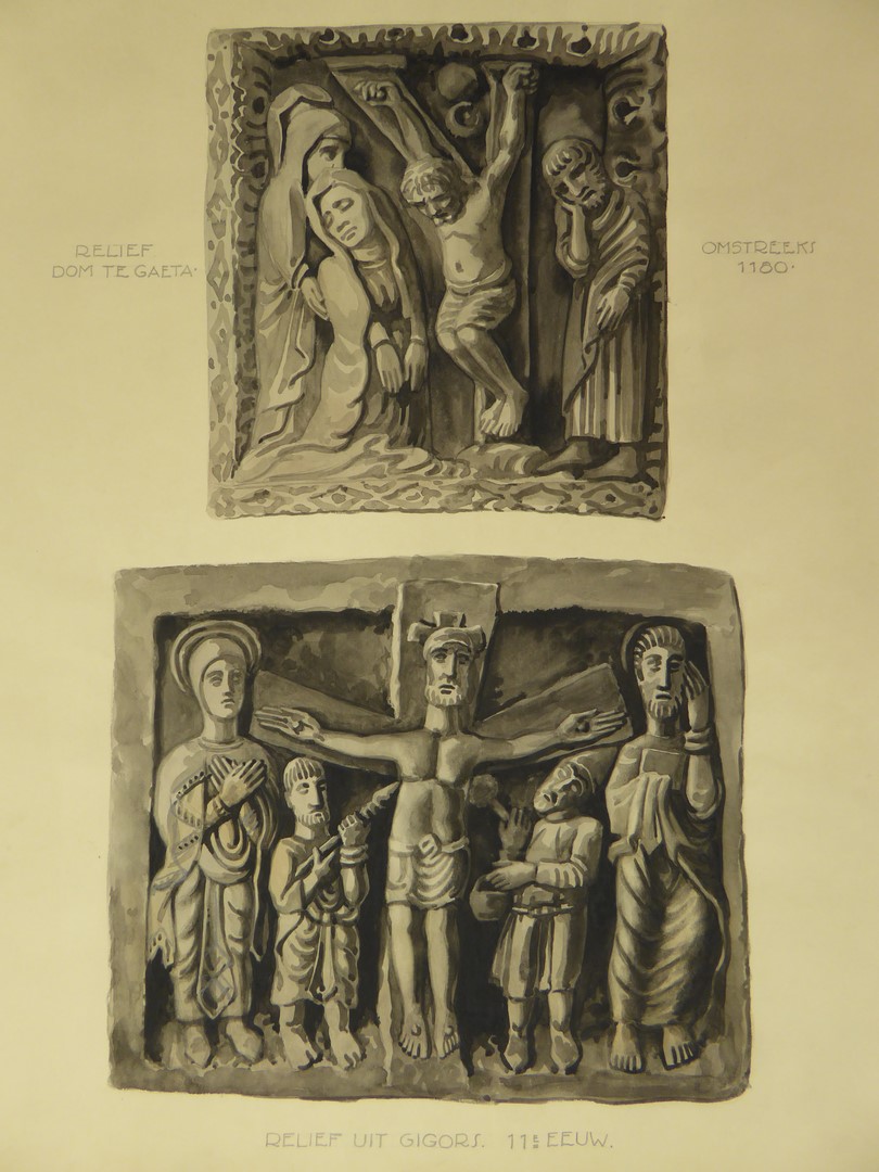 Reliëf met kruisiging (Gaeta Domkerk) en reliëf met kruisiging (Gisors), originelen 11de/12de eeuw