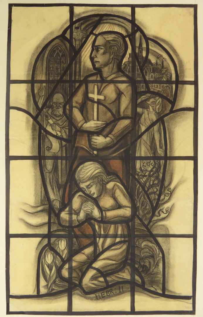 Ontwerptekening glas-in-loodraam Remonstrantse Kerk te Arnhem met Geloof en "Door het geloof..."