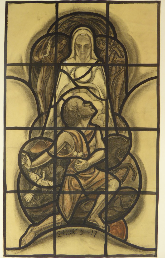 Ontwerptekening glas-in-loodraam Remonstrantse Kerk te Arnhem met Vrijheid en "2 Cor. 3-17"