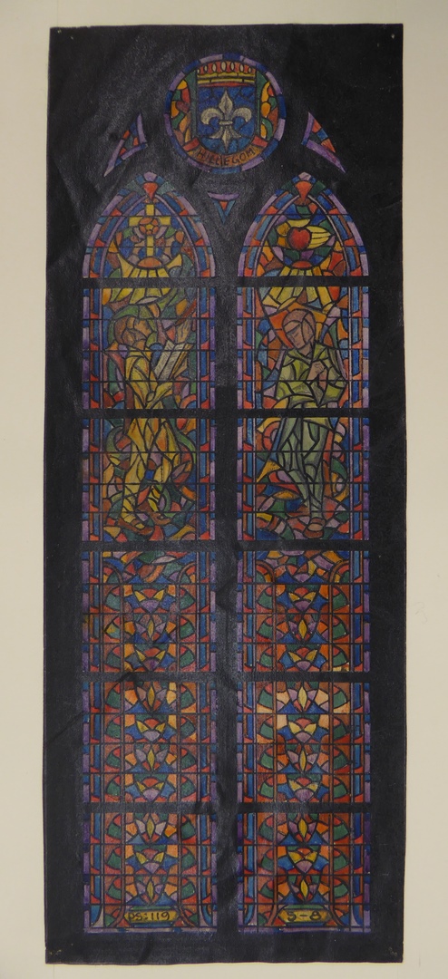 Ontwerptekening glas-in-loodraam Hervormde Kerk te Hillegom met wapen Hillegom en "Ps 119 5-8"