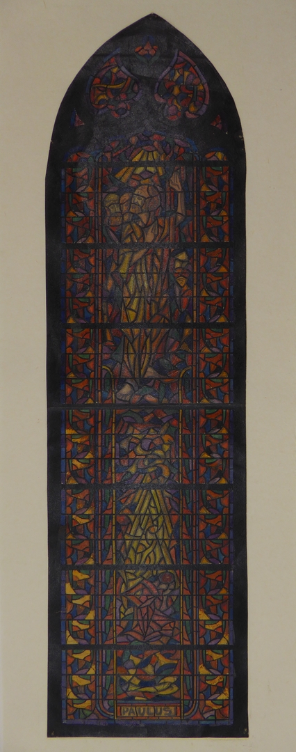 Ontwerptekening glas-in-loodraam met apostel Paulus en "Paulus", achter hem twee personen