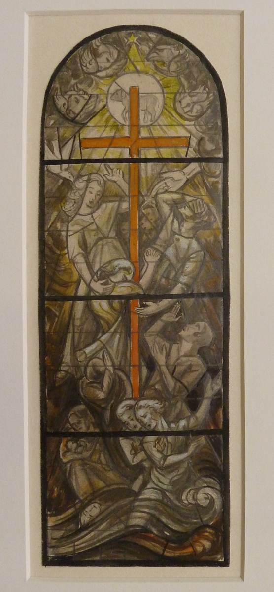 Ontwerptekening glas-in-loodraam met menigte rondom groot kruis, Lam Gods, evangelistensymbolen