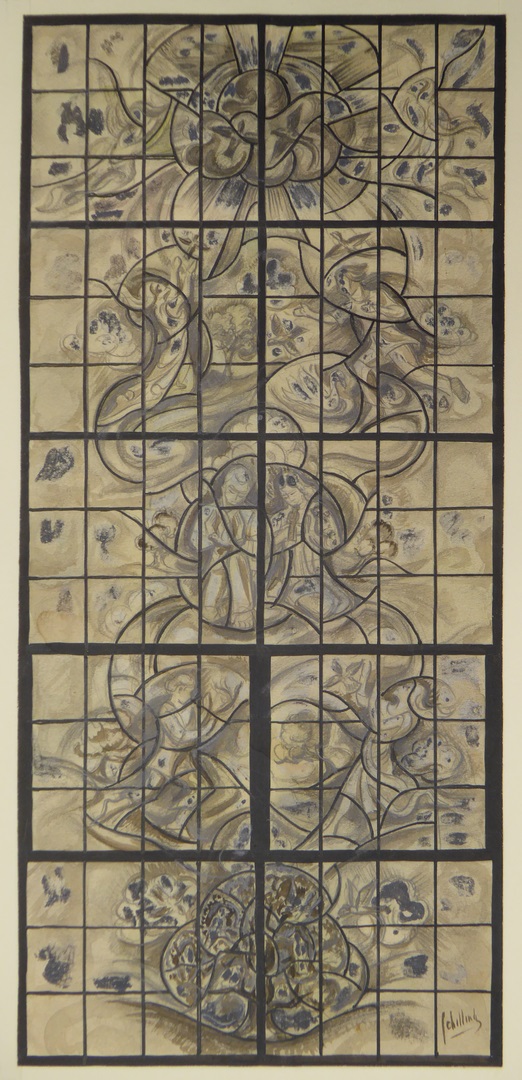 Ontwerptekening glas-in-loodraam woning te Arnhem(?) biddende man en vrouw, erboven 2 figuren