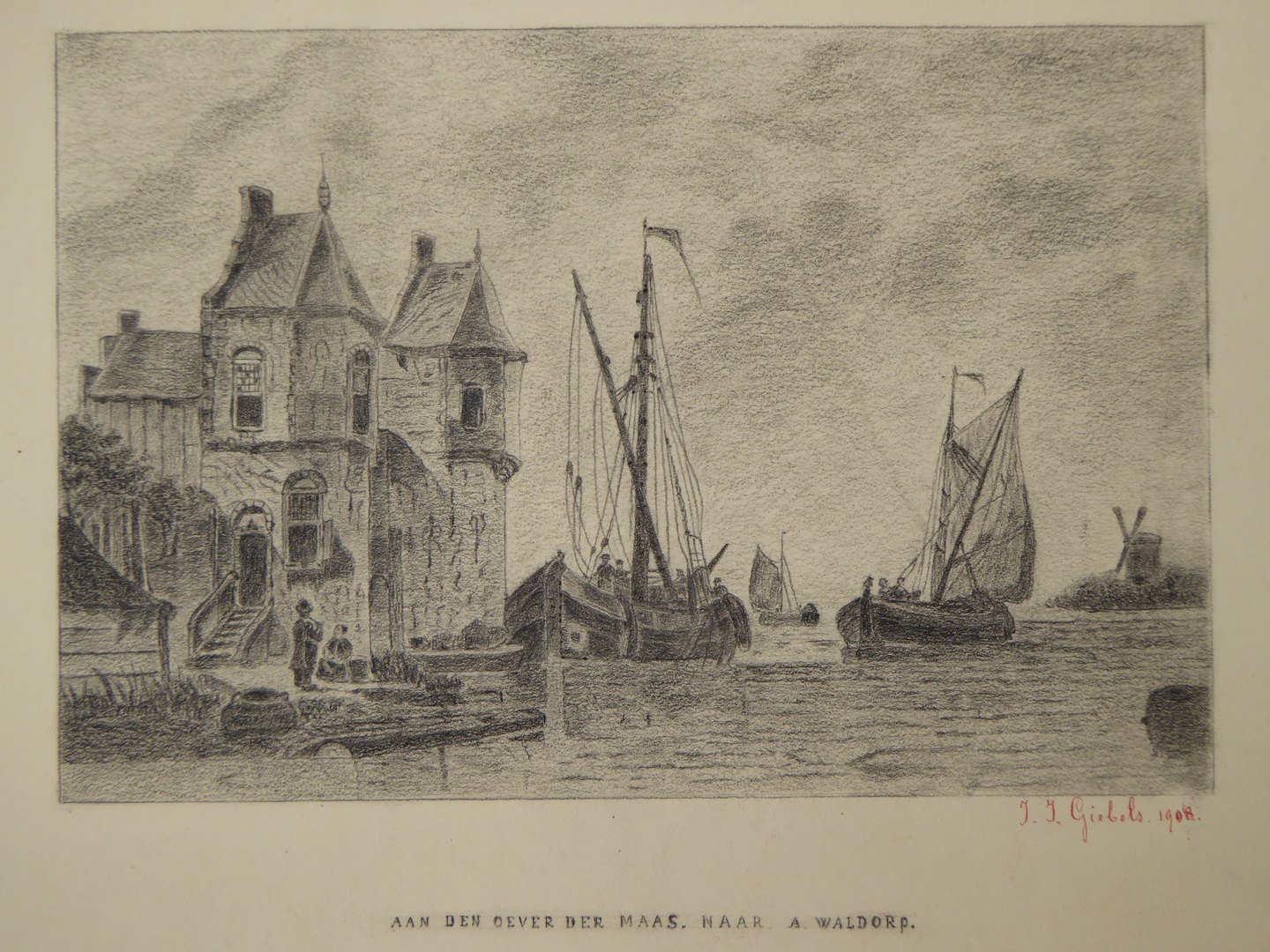 Riviergezicht met schepen, molen en kasteel "Aan den oever der Maas"
