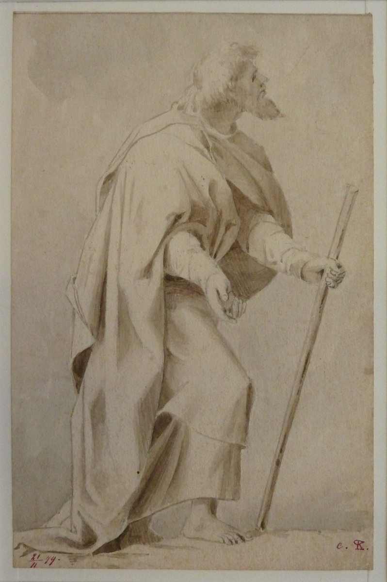 Voorstelling van apostel(?) met staf in hand, rechtsonder met "c.R.", linksonder met "21/11/79"
