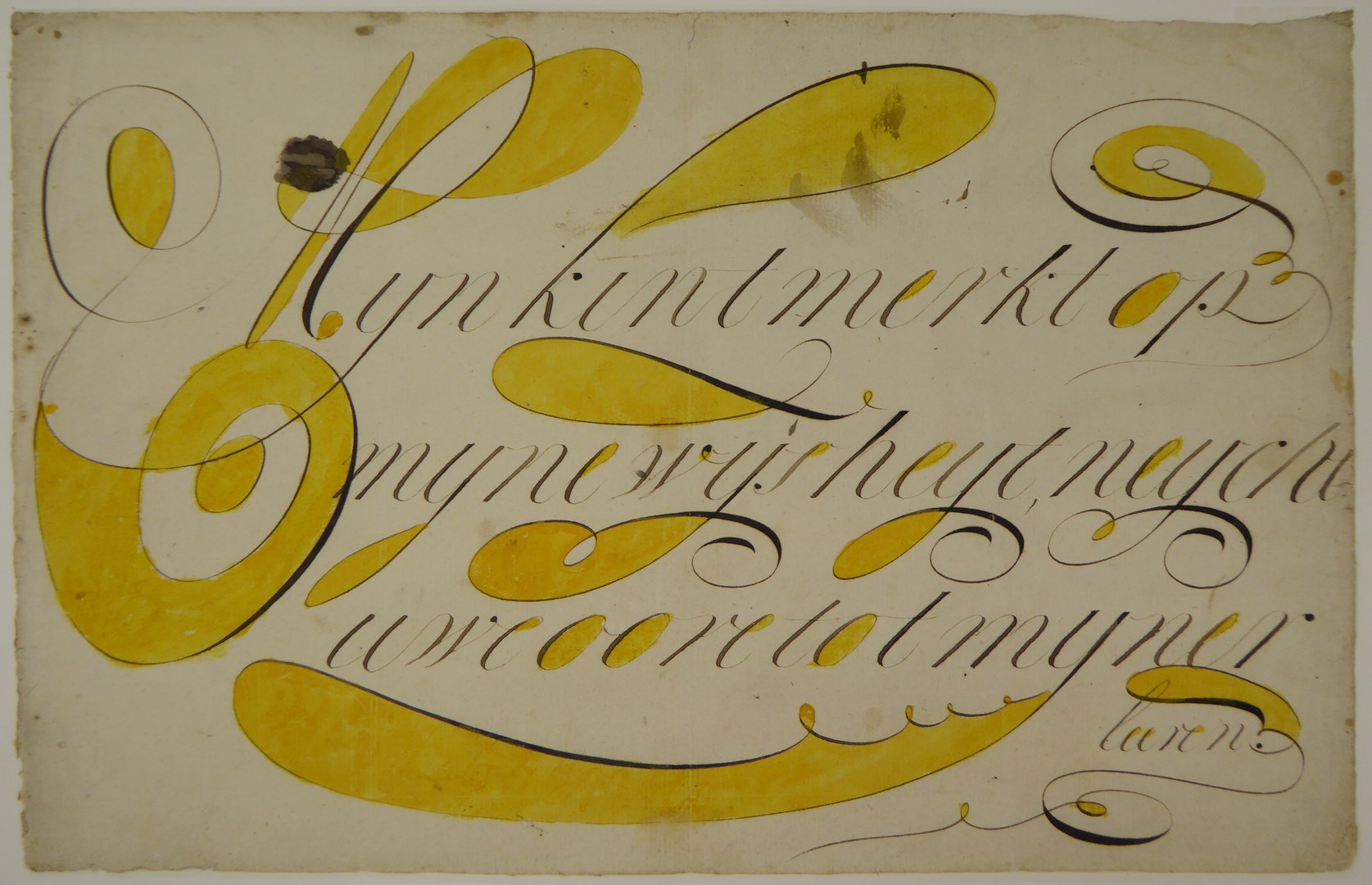 Kalligrafie met "Mijn kint merkt op mijne wijsheyt, neycht uwe oore tot mijner leeren."