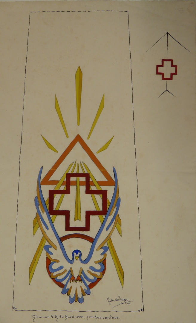 Ontwerp witte stola met duif, kruisje, driehoek, stralen en "gewoon dik te borduren..."