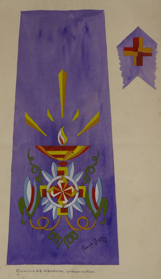 Ontwerp paarse stola met lamp en "gewoon dik te borduren, zonder contour"