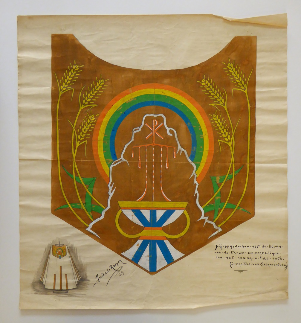 Ontwerp lichtbruin koorkapschild met tarwe, honing uit de rots en "...sacramentsdag..."