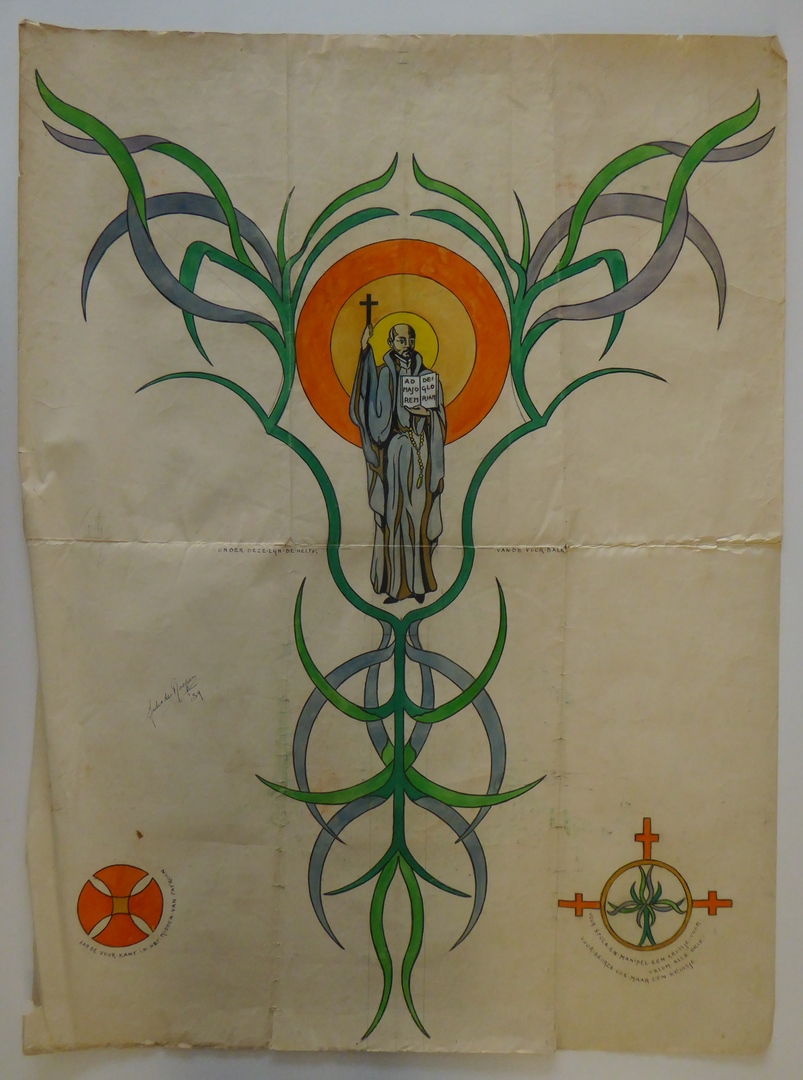 Ontwerp kazuifel, detail: monnik met kruis, rozenkrans en boek met "ad majorem dei gloriam"
