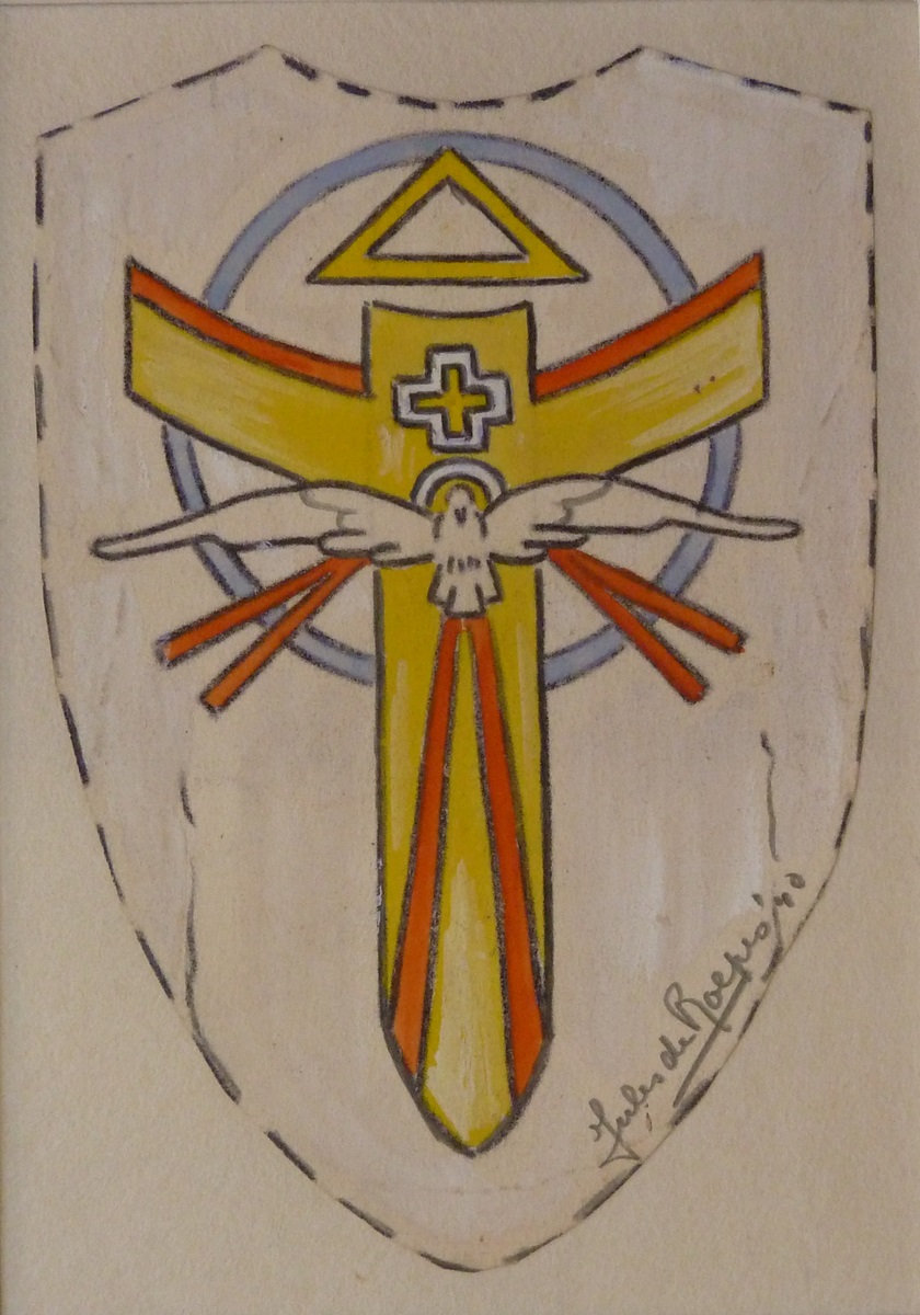 Ontwerp wit kazuifel, duif voor kruis, driehoek en cirkel, achterzijde gele baan met rood kruisje