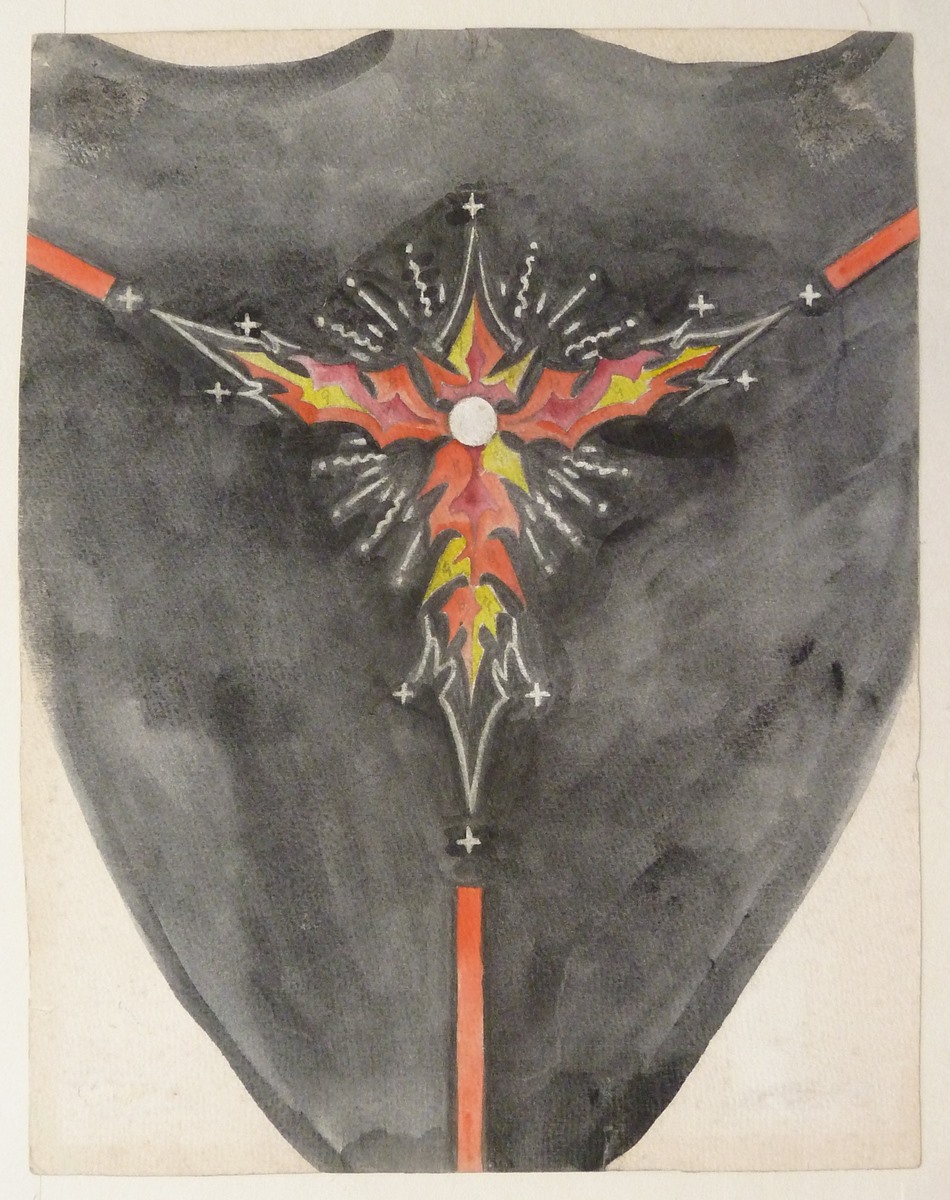 Ontwerp zwart kazuifel, detail met kruisvormige versiering in rood en geel, achterzijde ruwe schets