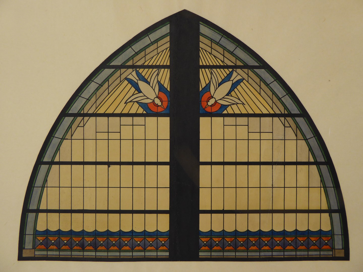 Ontwerptekening voor een glasraam met links en rechts een duif op een stralenbundel