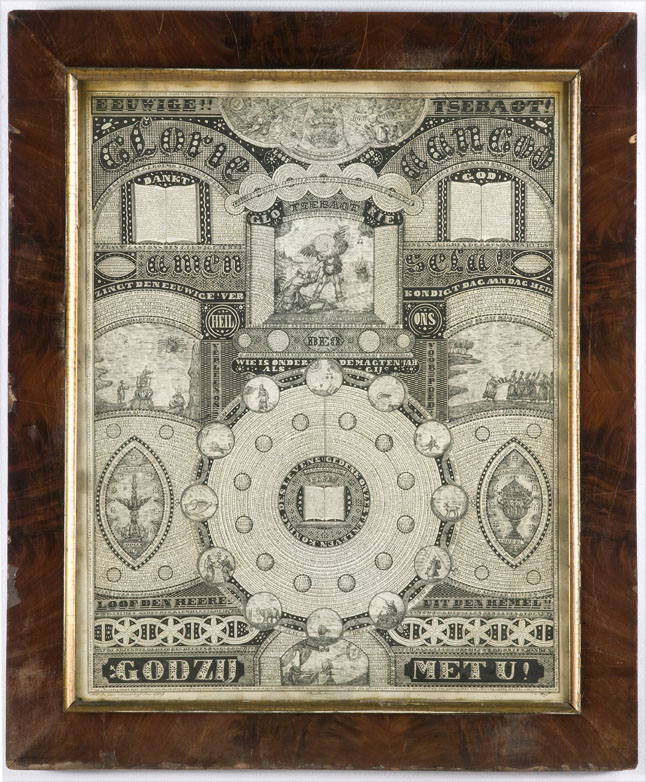 Kalligrafie met diverse bijbelse voorstellingen en dierenriem en met "... glorie aan god ..."