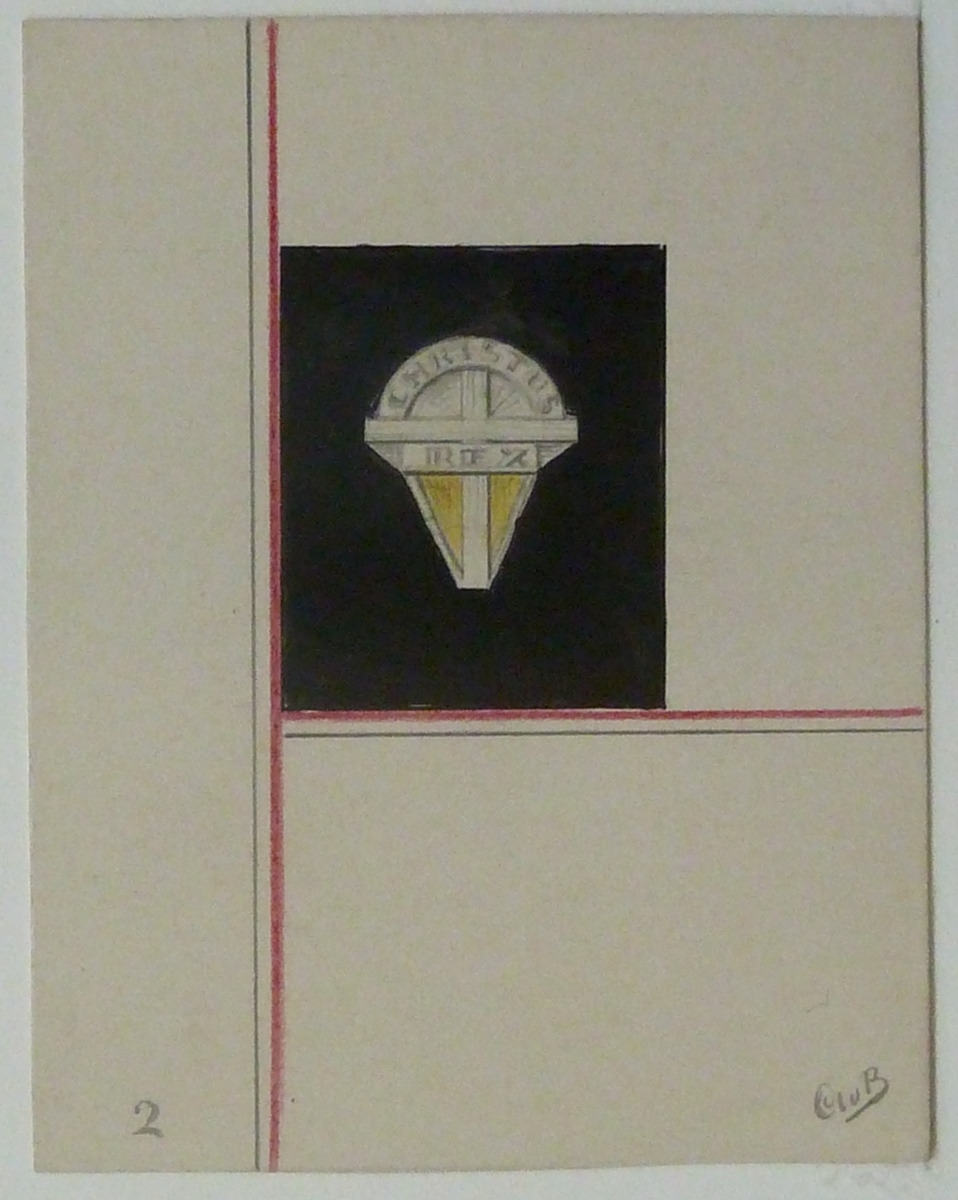 Ontwerp Christus Koning speldje met "Christus Rex" en kruis waarboven boogvorm