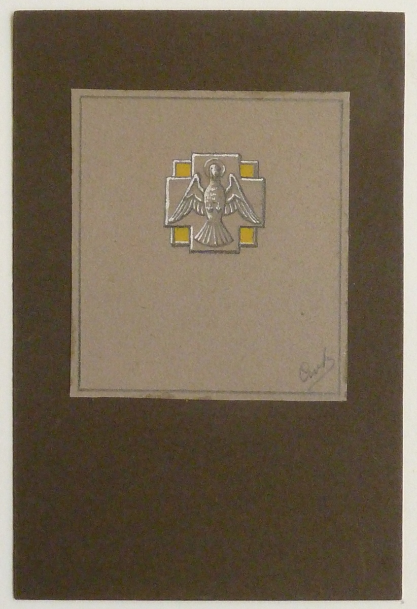 Ontwerp Christus Koning speldje met duif met aureool op gelijkarmig kruis op geel vierkant