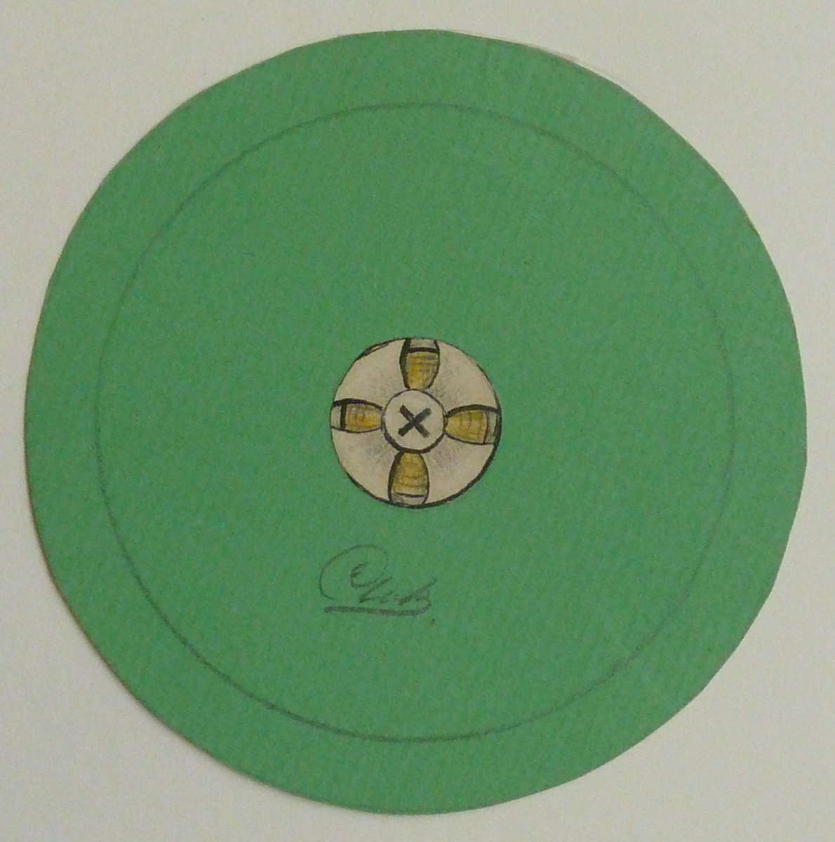 Ontwerp Christus Koning speldje met stralende hostie op geel gelijkarmig kruis, rond model