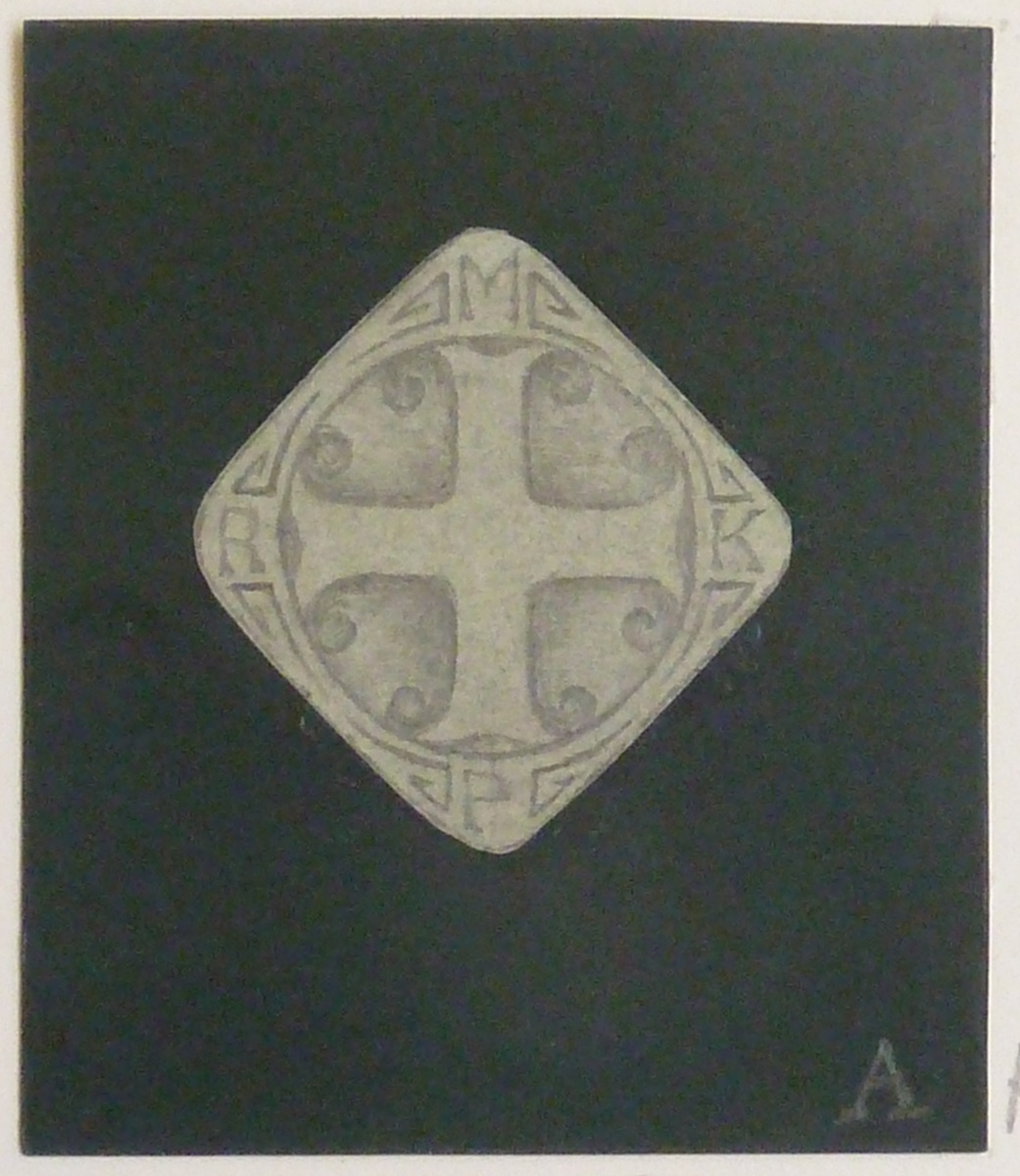 Ontwerp speldje Rooms Katholiek Meisjes Patronaat met gelijkarmig kruis in cirkel, ruitvormig