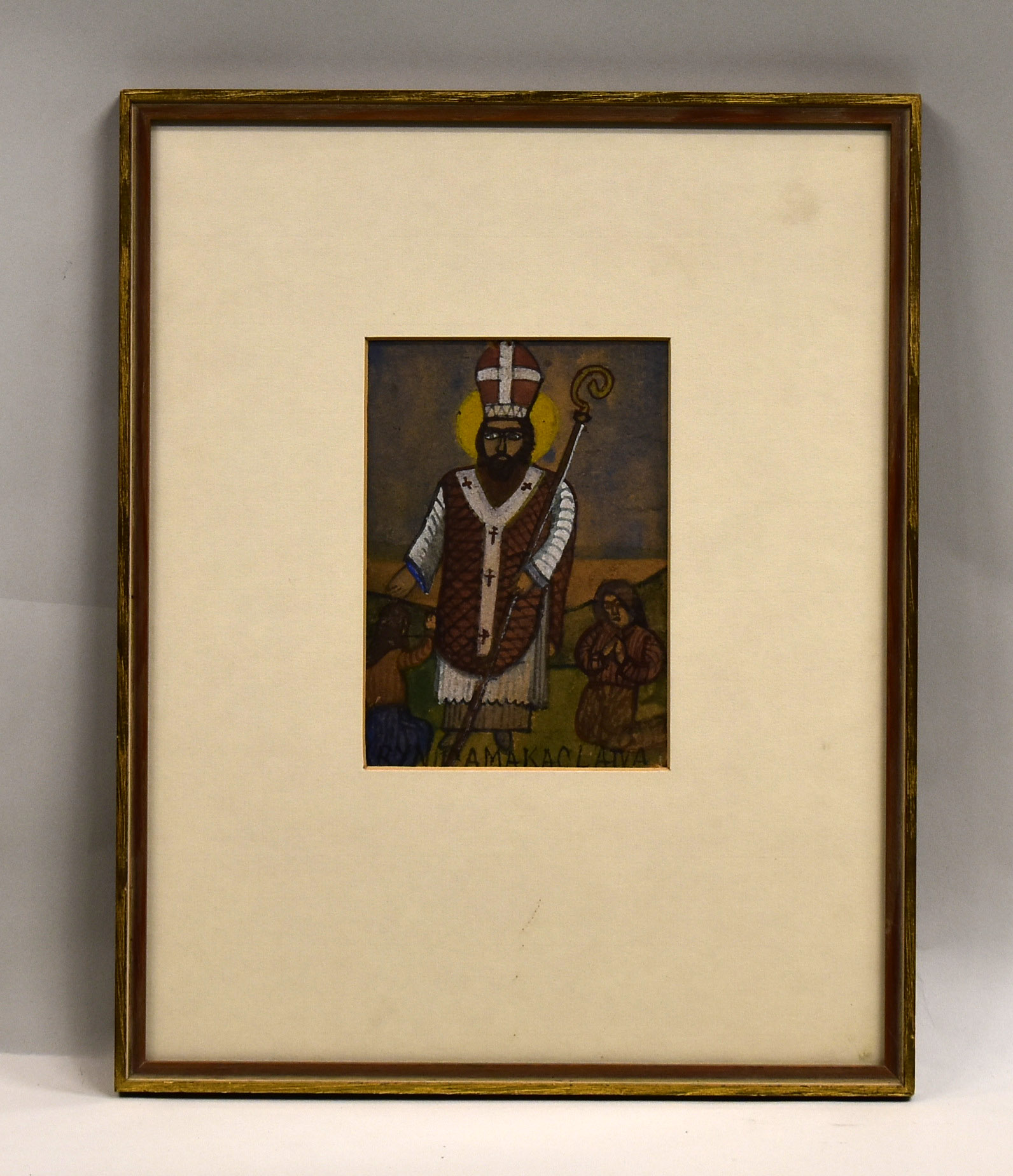Sint Nicolaas met twee knielende figuren en met "ryniu amakaclatva"