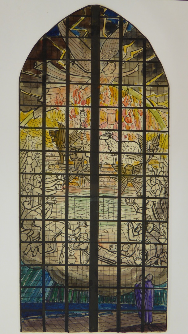 Ontwerp glas-in-loodraam Zuiderkerk te Rotterdam met scène uit Openbaringen 4-5, Lam Gods geflankeerd door evangelistensymbolen en 24 oudsten met kronen