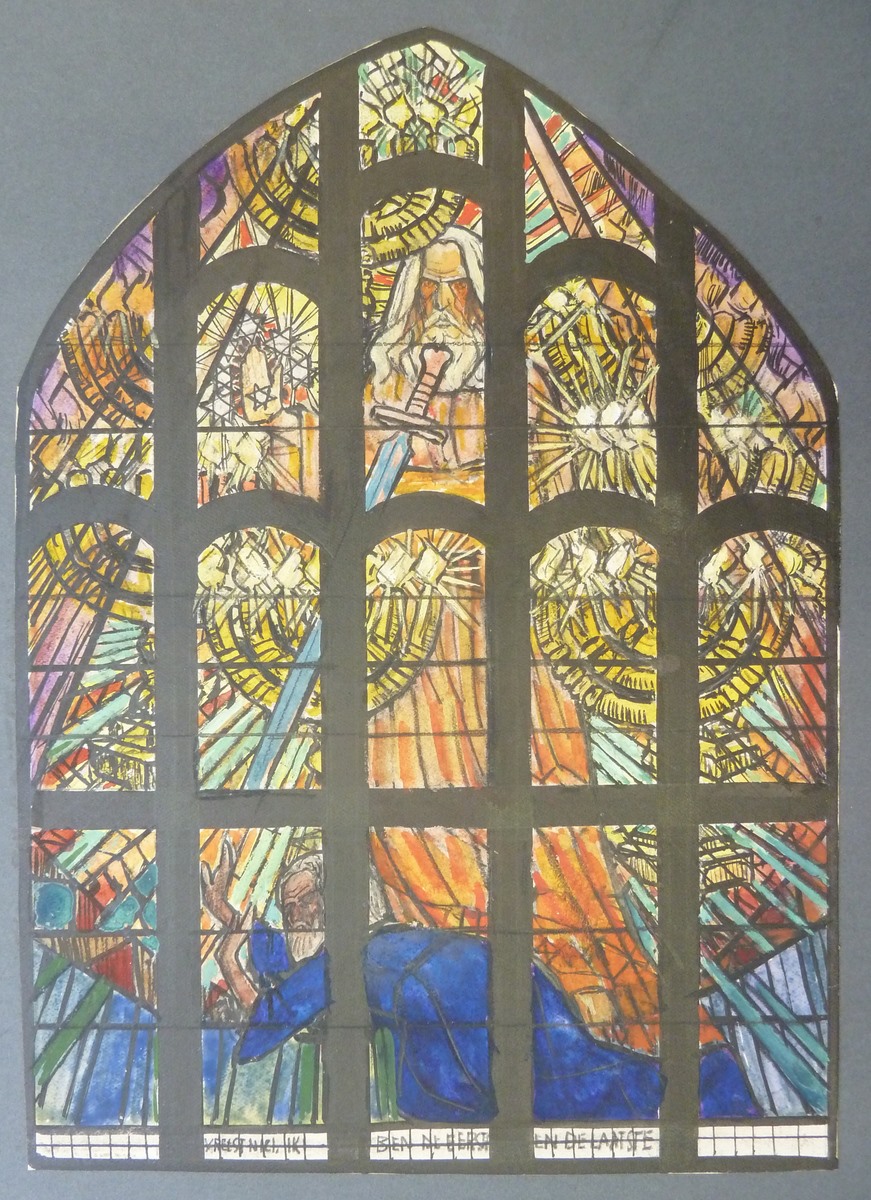 Ontwerp glas-in-loodraam Oranjekerk te Rotterdam Hillegersberg met scène uit de Apocalyps met "Vreest niet, Ik ben de eerste en de laatste"