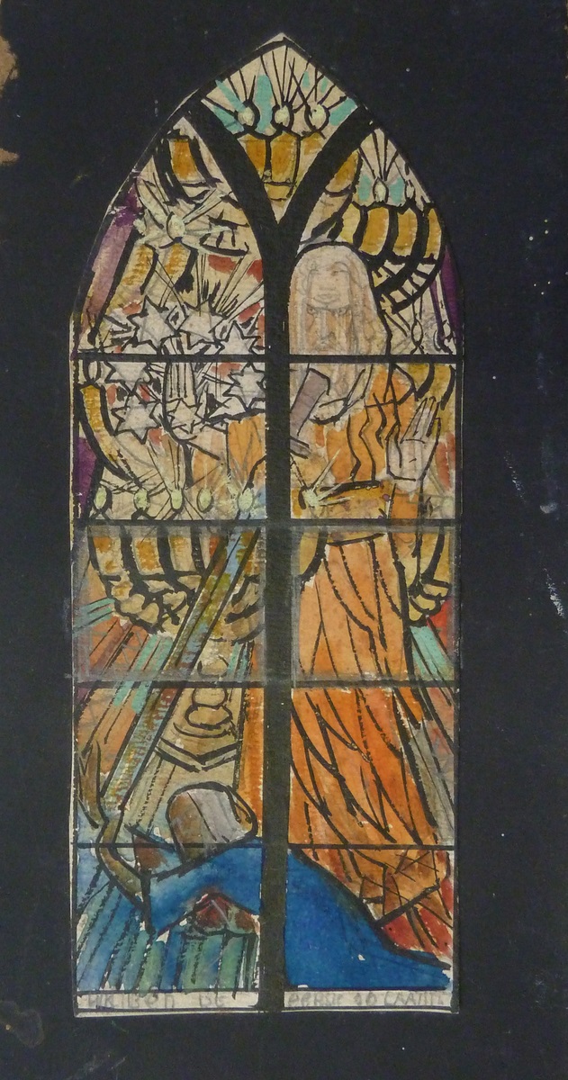 Ontwerp glas-in-loodraam Oranjekerk te Rotterdam Hillegersberg met scène uit de Apocalyps met "Ik ben de eerste en laatste", kz. fragment schilderij met bloemen