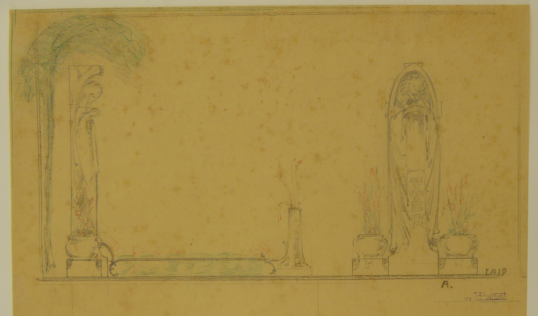 Ontwerptekening voor een grafmonument met een staande figuur en tekst "Moge hij leven in God..."