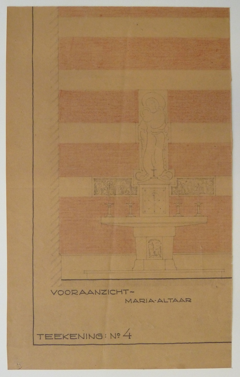 Vooraanzicht van Maria-altaar met staande Maria met kind