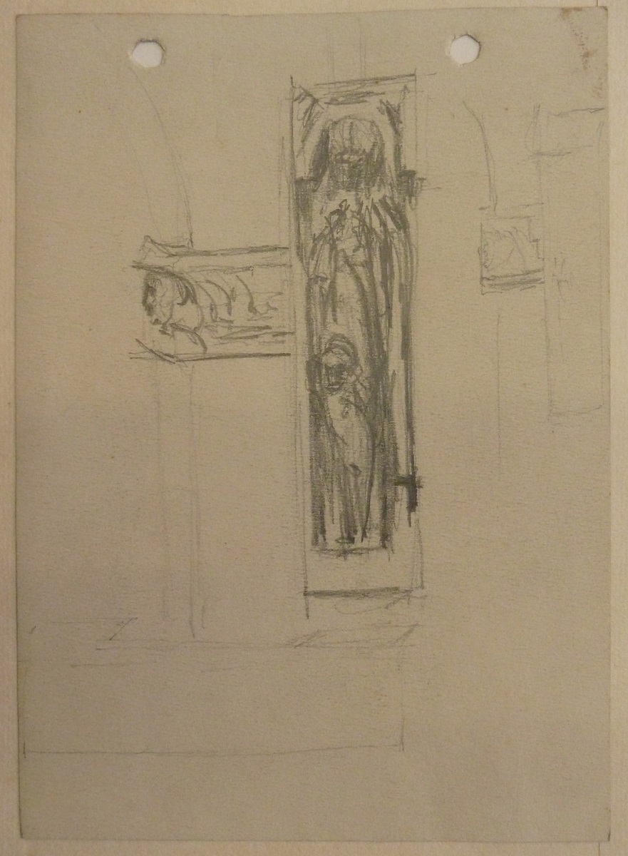 Studieblad met aan de voor- en achterzijde een staande heilige en een kleinere figuur ervoor