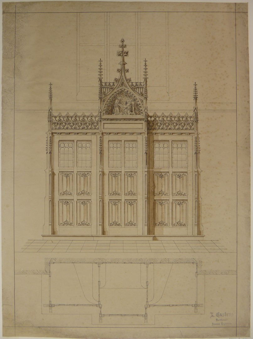 Biechtstoel in neogotische stijl (zicht van voren en van boven af)