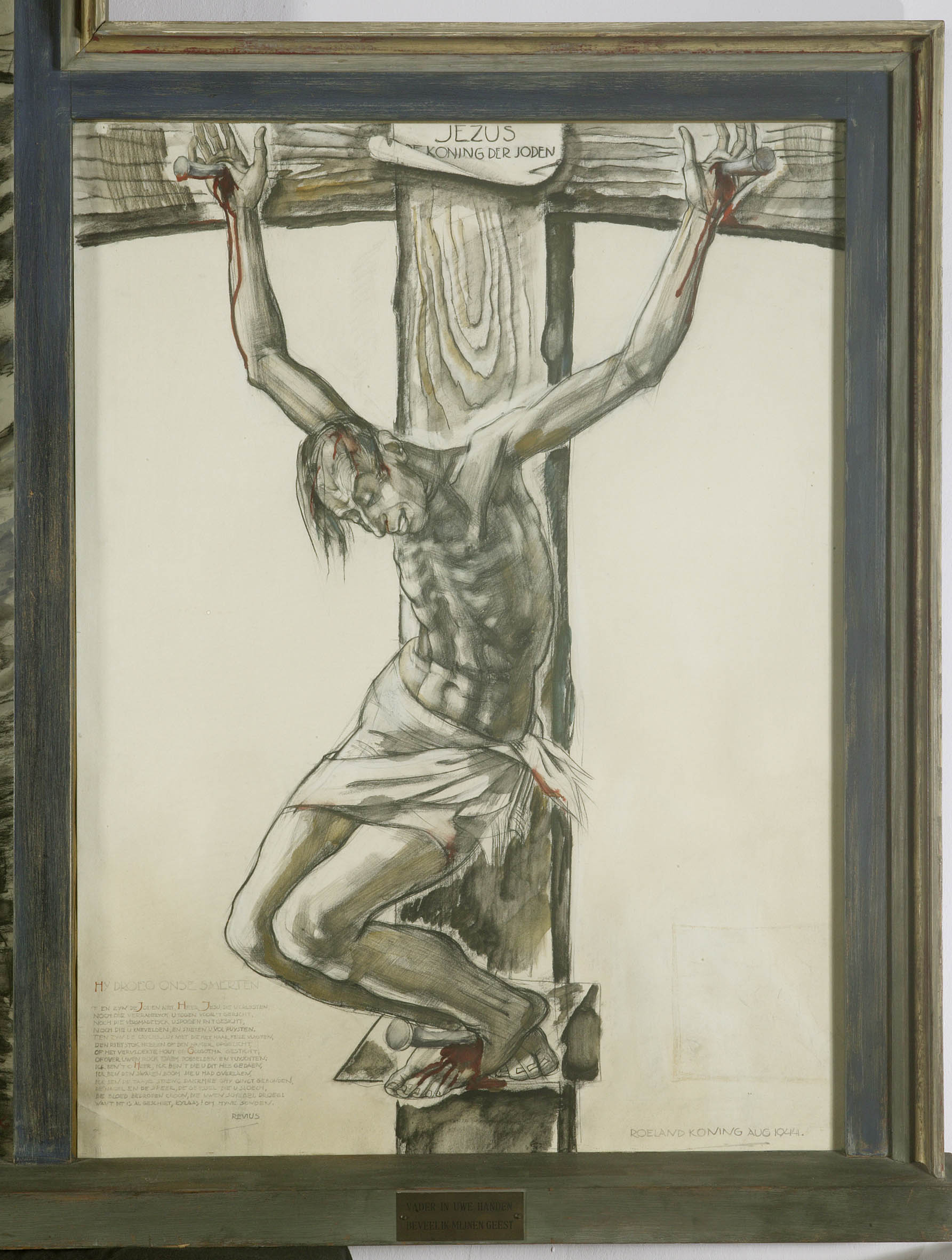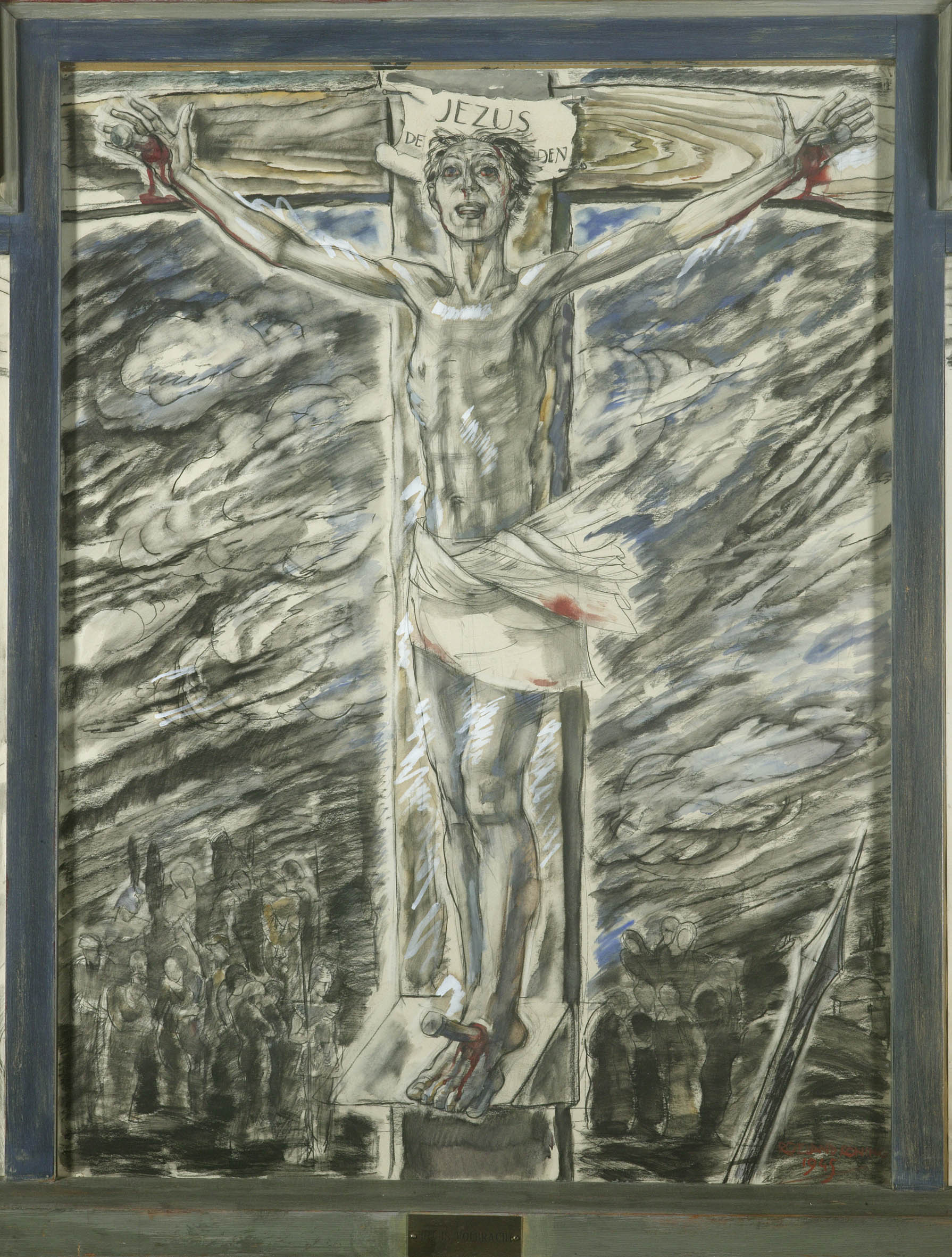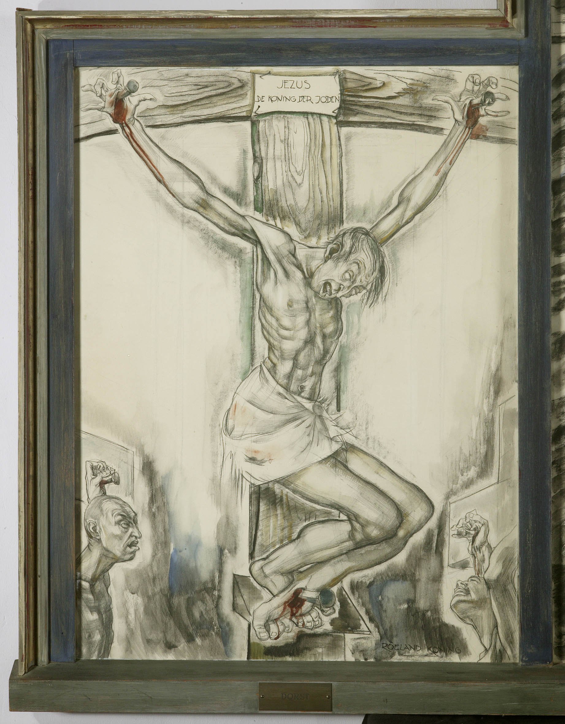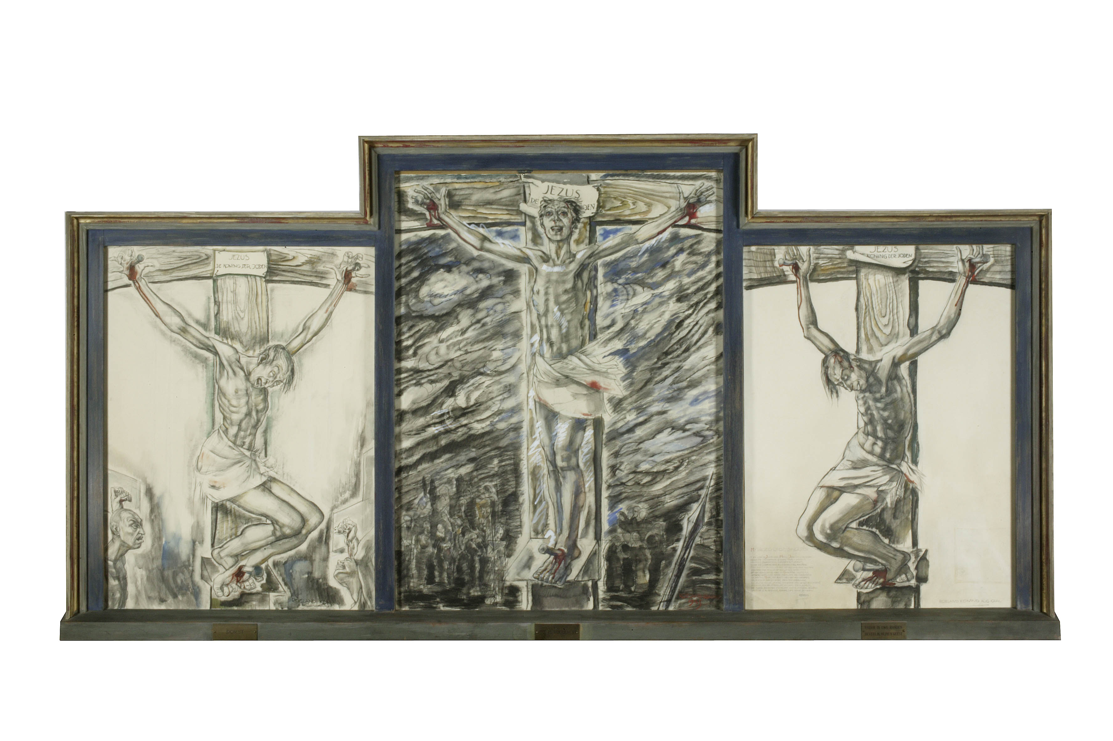 Tekening : drieluik met op elk luik een gekruisigde Christus