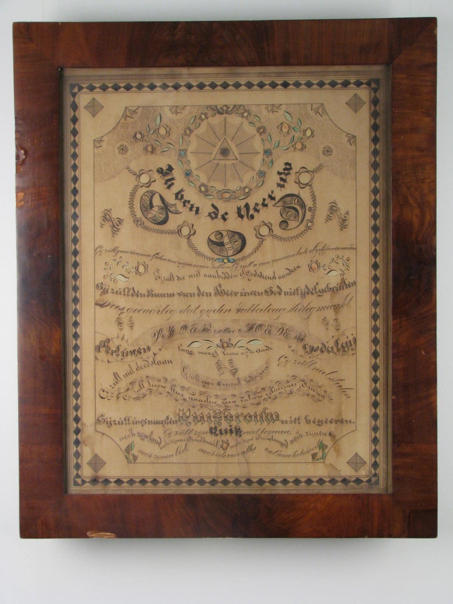 Alziend oog waaronder in verschillende lettertypes in kalligrafie de tien geboden, ingelijst